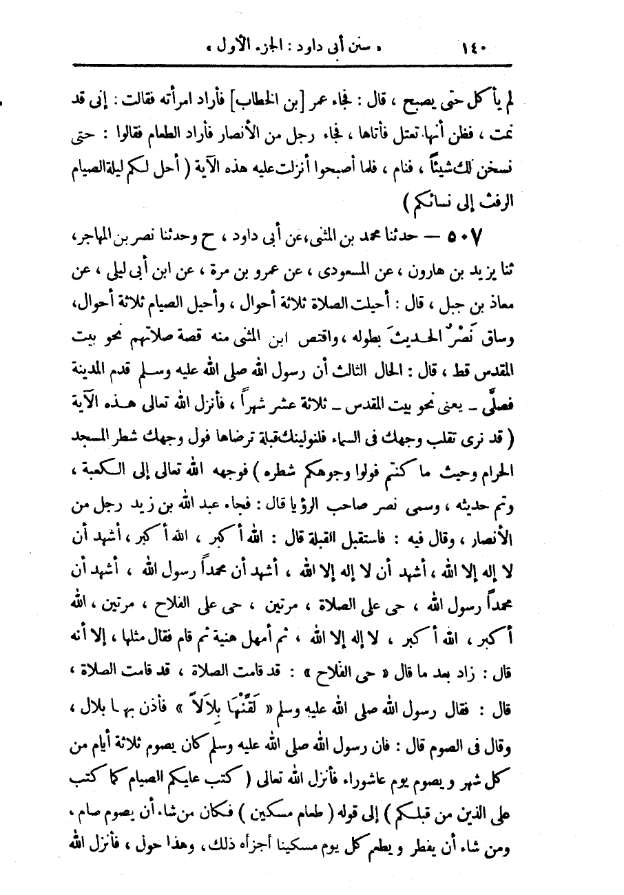 507 - حَدَّثَنَا مُحَمَّدُ بْنُ الْمُثَنَّى، عَنْ أَبِي دَاوُدَ، ح وَحَدَّثَنَا نَصْرُ بْنُ الْمُهَاجِرِ، حَدَّثَنَا يَزِيدُ بْنُ هَارُونَ، عَنِ الْمَسْعُودِيِّ، عَنْ عَمْرِو بْنِ مُرَّةَ، عَنِ ابْنِ أَبِي لَيْلَى، عَنْ مُعَاذِ بْنِ جَبَلٍ، قَالَ: §أُحِيلَتِ الصَّلَاةُ ثَلَاثَةَ أَحْوَالٍ، وَأُحِيلَ الصِّيَامُ ثَلَاثَةَ أَحْوَالٍ - وَسَاقَ نَصْرٌ الْحَدِيثَ بِطُولِهِ وَاقْتَصَّ ابْنُ الْمُثَنَّى مِنْهُ قِصَّةَ صَلَاتِهِمْ نَحْوَ بَيْتِ الْمَقْدِسِ قَطْ - قَالَ: الْحَالُ الثَّالِثُ أَنَّ رَسُولَ اللَّهِ صَلَّى اللهُ عَلَيْهِ وَسَلَّمَ قَدِمَ الْمَدِينَةَ فَصَلَّى - يَعْنِي نَحْوَ بَيْتِ الْمَقْدِسِ - ثَلَاثَةَ عَشَرَ شَهْرًا، فَأَنْزَلَ اللَّهُ تَعَالَى هَذِهِ الْآيَةَ: {قَدْ نَرَى تَقَلُّبَ وَجْهِكَ فِي السَّمَاءِ فَلَنُوَلِّيَنَّكَ قِبْلَةً تَرْضَاهَا فَوَلِّ وَجْهَكَ شَطْرَ الْمَسْجِدِ الْحَرَامِ وَحَيْثُ مَا كُنْتُمْ فَوَلُّوا وُجُوهَكُمْ شَطْرَهُ} [البقرة: 144] فَوَجَّهَهُ اللَّهُ تَعَالَى إِلَى الْكَعْبَةِ - وَتَمَّ حَدِيثُهُ - وَسَمَّى نَصْرٌ صَاحِبَ الرُّؤْيَا، قَالَ: فَجَاءَ عَبْدُ اللَّهِ بْنُ زَيْدٍ، رَجُلٌ مِنَ الْأَنْصَارِ، وَقَالَ فِيهِ: فَاسْتَقْبَلَ الْقِبْلَةَ، قَالَ: اللَّهُ أَكْبَرُ اللَّهُ أَكْبَرُ، أَشْهَدُ أَنْ لَا إِلَهَ إِلَّا اللَّهُ، أَشْهَدُ أَنْ لَا إِلَهَ إِلَّا اللَّهُ، أَشْهَدُ أَنَّ مُحَمَّدًا رَسُولُ اللَّهِ، أَشْهَدُ أَنَّ مُحَمَّدًا رَسُولُ اللَّهِ، حَيَّ عَلَى الصَّلَاةِ، مَرَّتَيْنِ، حَيَّ عَلَى الْفَلَاحِ، مَرَّتَيْنِ، اللَّهُ أَكْبَرُ، اللَّهُ أَكْبَرُ، لَا إِلَهَ إِلَّا اللَّهُ، ثُمَّ أَمْهَلَ هُنَيَّةً، ثُمَّ قَامَ، فَقَالَ مِثْلَهَا، إِلَّا أَنَّهُ قَالَ: زَادَ بَعْدَ مَا قَالَ: حَيَّ عَلَى الْفَلَاحِ، قَدْ قَامَتِ الصَّلَاةُ، قَدْ قَامَتِ الصَّلَاةُ، قَالَ: فَقَالَ رَسُولُ اللَّهِ صَلَّى اللهُ عَلَيْهِ وَسَلَّمَ: «لَقِّنْهَا بِلَالًا» فَأَذَّنَ بِهَا بِلَالٌ. وَقَالَ فِي الصَّوْمِ: قَالَ: فَإِنَّ رَسُولَ اللَّهِ صَلَّى اللهُ عَلَيْهِ وَسَلَّمَ كَانَ " يَصُومُ ثَلَاثَةَ أَيَّامٍ مِنْ كُلِّ شَهْرٍ، وَيَصُومُ يَوْمَ عَاشُورَاءَ، فَأَنْزَلَ اللَّهُ تَعَالَى: {كُتِبَ عَلَيْكُمُ الصِّيَامُ كَمَا كُتِبَ عَلَى الَّذِينَ مِنْ قَبْلِكُمْ} [البقرة: 183] إِلَى قَوْلِهِ {طَعَامُ مِسْكِينٍ} [البقرة: 184] فَمَنْ شَاءَ أَنْ يَصُومَ صَامَ، وَمَنْ شَاءَ أَنْ يُفْطِرَ، وَيُطْعِمَ كُلَّ يَوْمٍ مِسْكِينًا، أَجْزَأَهُ ذَلِكَ، وَهَذَا حَوْلٌ، فَأَنْزَلَ اللَّهُ -[141]- تَعَالَى: {شَهْرُ رَمَضَانَ الَّذِي أُنْزِلَ فِيهِ الْقُرْآنُ} [البقرة: 185] إِلَى {أَيَّامٍ أُخَرَ} [البقرة: 184] فَثَبَتَ الصِّيَامُ عَلَى مَنْ شَهِدَ الشَّهْرَ وَعَلَى الْمُسَافِرِ أَنْ يَقْضِيَ، وَثَبَتَ الطَّعَامُ لِلشَّيْخِ الْكَبِيرِ وَالْعَجُوزِ اللَّذَيْنِ لَا يَسْتَطِيعَانِ الصَّوْمَ "، وَجَاءَ صِرْمَةُ وَقَدْ عَمِلَ يَوْمَهُ وَسَاقَ الْحَدِيثَ