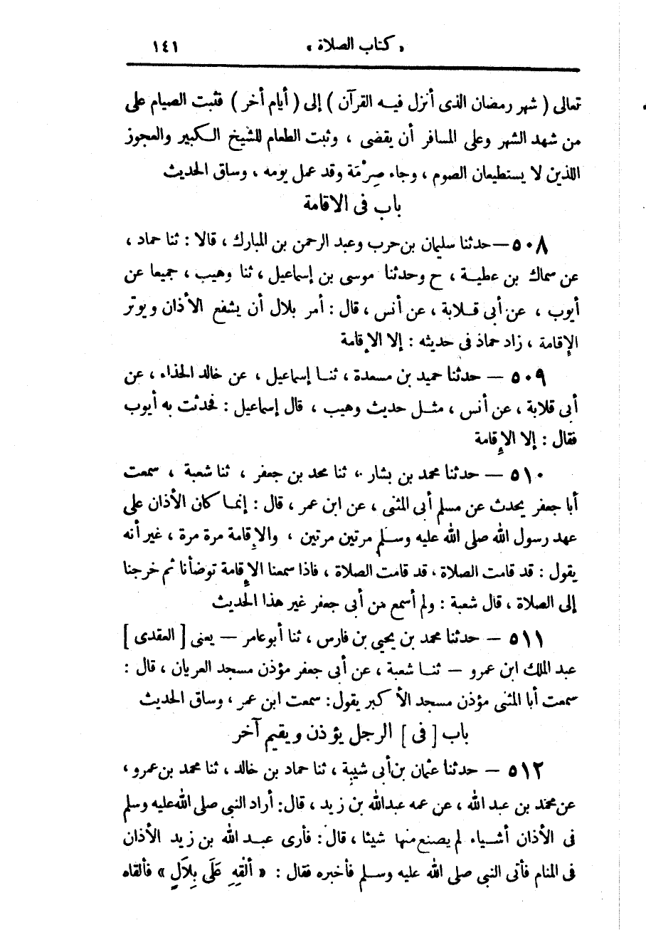 508 - حَدَّثَنَا سُلَيْمَانُ بْنُ حَرْبٍ، وَعَبْدُ الرَّحْمَنِ بْنُ الْمُبَارَكِ، قَالَا: حَدَّثَنَا حَمَّادٌ، عَنْ سِمَاكِ بْنِ عَطِيَّةَ، ح وَحَدَّثَنَا مُوسَى بْنُ إِسْمَاعِيلَ، حَدَّثَنَا وُهَيْبٌ، جَمِيعًا عَنْ أَيُّوبَ، عَنْ أَبِي قِلَابَةَ، عَنْ أَنَسٍ، قَالَ: «§أُمِرَ بِلَالٌ أَنْ يَشْفَعَ الْأَذَانَ وَيُوتِرَ الْإِقَامَةَ»، زَادَ حَمَّادٌ فِي حَدِيثِهِ: إِلَّا الْإِقَامَةَ،