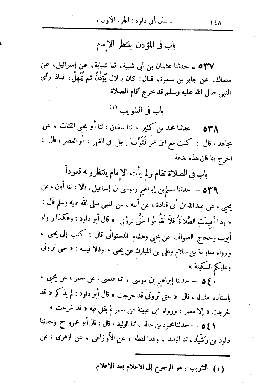 539 - حَدَّثَنَا مُسْلِمُ بْنُ إِبْرَاهِيمَ، وَمُوسَى بْنُ إِسْمَاعِيلَ قَالَا: حَدَّثَنَا أَبَانُ، عَنْ يَحْيَى، عَنْ عَبْدِ اللَّهِ بْنِ أَبِي قَتَادَةَ، عَنْ أَبِيهِ، عَنِ النَّبِيِّ صَلَّى اللهُ عَلَيْهِ وَسَلَّمَ قَالَ: «§إِذَا أُقِيمَتِ الصَّلَاةُ فَلَا تَقُومُوا حَتَّى تَرَوْنِي»، قَالَ أَبُو دَاوُدَ: هَكَذَا رَوَاهُ أَيُّوبُ، وَحَجَّاجٌ الصَّوَّافُ، عَنْ يَحْيَى، وَهِشَامٍ الدَّسْتُوَائِيِّ، قَالَ: كَتَبَ إِلَيَّ يَحْيَى، وَرَوَاهُ مُعَاوِيَةُ بْنُ سَلَّامٍ، وَعَلِيُّ بْنُ الْمُبَارَكِ، عَنْ يَحْيَى، وَقَالَا فِيهِ: «حَتَّى تَرَوْنِي وَعَلَيْكُمُ السَّكِينَةَ»،