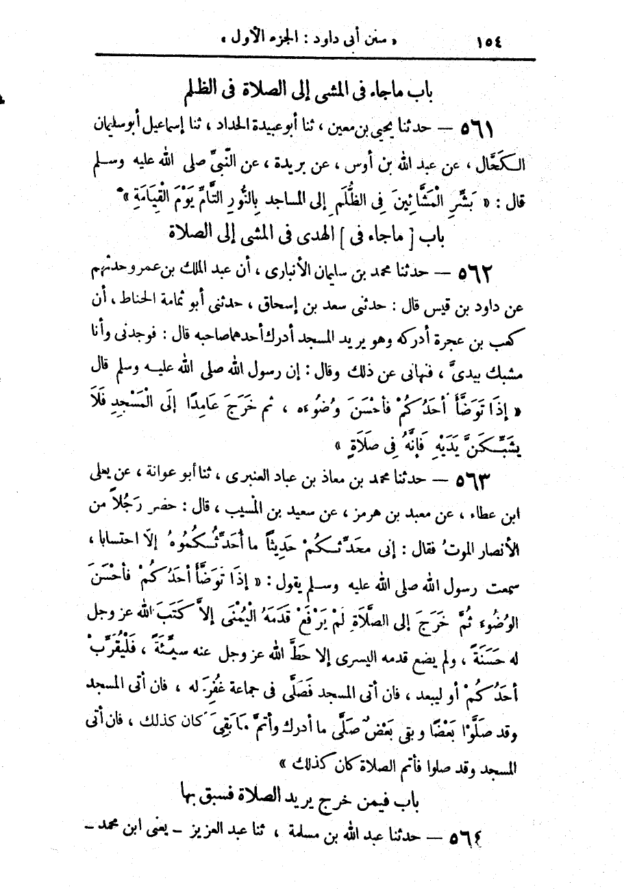561 - حَدَّثَنَا يَحْيَى بْنُ مَعِينٍ، حَدَّثَنَا أَبُو عُبَيْدَةَ الْحَدَّادُ، حَدَّثَنَا إِسْمَاعِيلُ أَبُو سُلَيْمَانَ الْكَحَّالُ، عَنْ عَبْدِ اللَّهِ بْنِ أَوْسٍ، عَنْ بُرَيْدَةَ، عَنِ النَّبِيِّ صَلَّى اللهُ عَلَيْهِ وَسَلَّمَ، قَالَ: «§بَشِّرِ الْمَشَّائِينَ فِي الظُّلَمِ إِلَى الْمَسَاجِدِ بِالنُّورِ التَّامِّ يَوْمَ الْقِيَامَةِ»