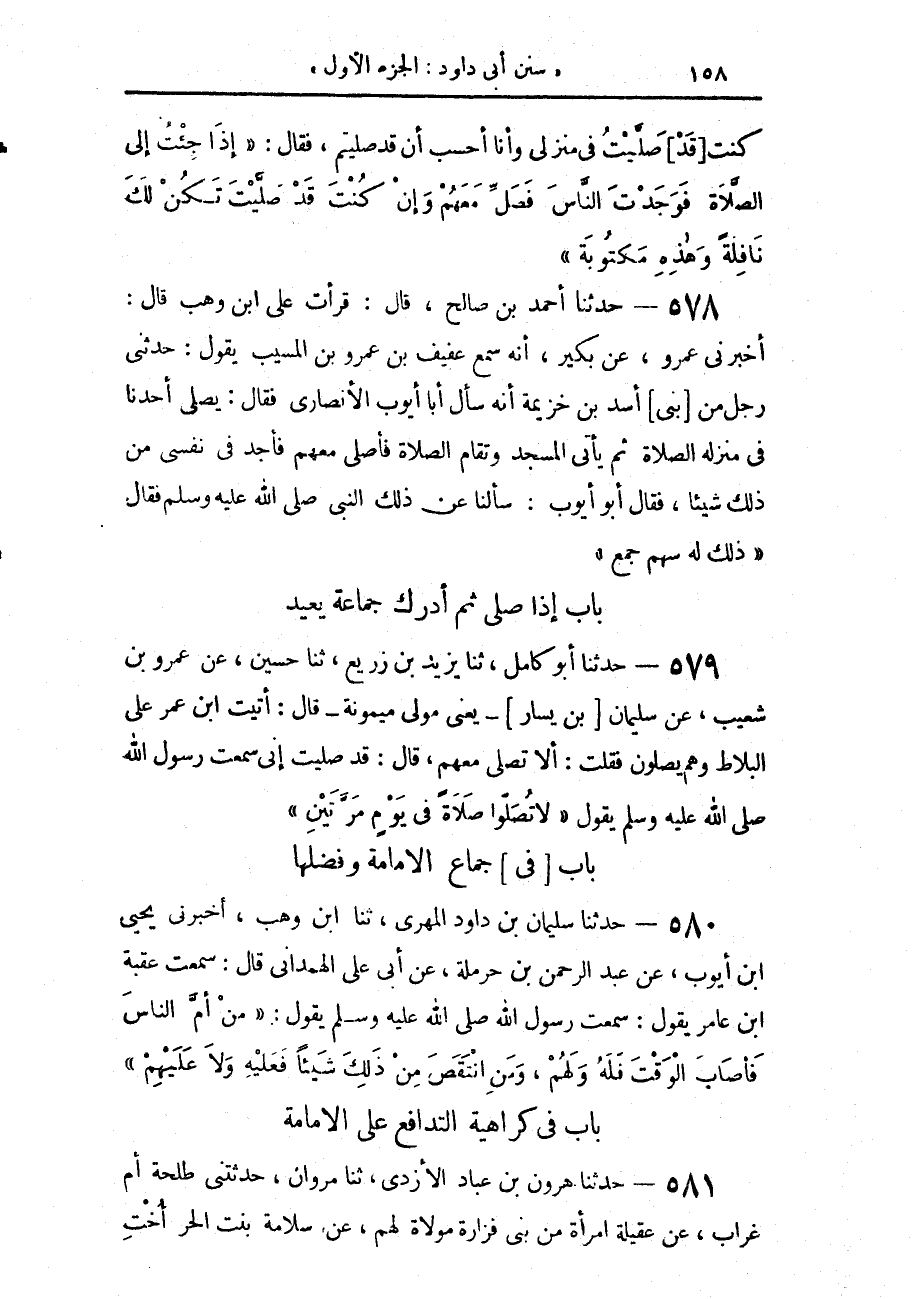 578 - حَدَّثَنَا أَحْمَدُ بْنُ صَالِحٍ، قَالَ: قَرَأْتُ عَلَى ابْنِ وَهْبٍ، قَالَ: أَخْبَرَنِي عَمْرٌو، عَنْ بُكَيْرٍ، أَنَّهُ سَمِعَ عَفِيفَ بْنَ عَمْرِو بْنِ الْمُسَيِّبِ، يَقُولُ: حَدَّثَنِي رَجُلٌ، مِنْ بَنِي أَسَدِ بْنِ خُزَيْمَةَ، أَنَّهُ سَأَلَ أَبَا أَيُّوبَ الْأَنْصَارِيَّ، فَقَالَ: يُصَلِّي أَحَدُنَا فِي مَنْزِلِهِ الصَّلَاةَ، ثُمَّ يَأْتِي الْمَسْجِدَ وَتُقَامُ الصَّلَاةُ فَأُصَلِّي مَعَهُمْ فَأَجِدُ فِي نَفْسِي مِنْ ذَلِكَ شَيْئًا، فَقَالَ أَبُو أَيُّوبَ: سَأَلْنَا عَنْ ذَلِكَ النَّبِيَّ صَلَّى اللهُ عَلَيْهِ وَسَلَّمَ، فَقَالَ: «§ذَلِكَ لَهُ سَهْمُ جَمْعٍ»