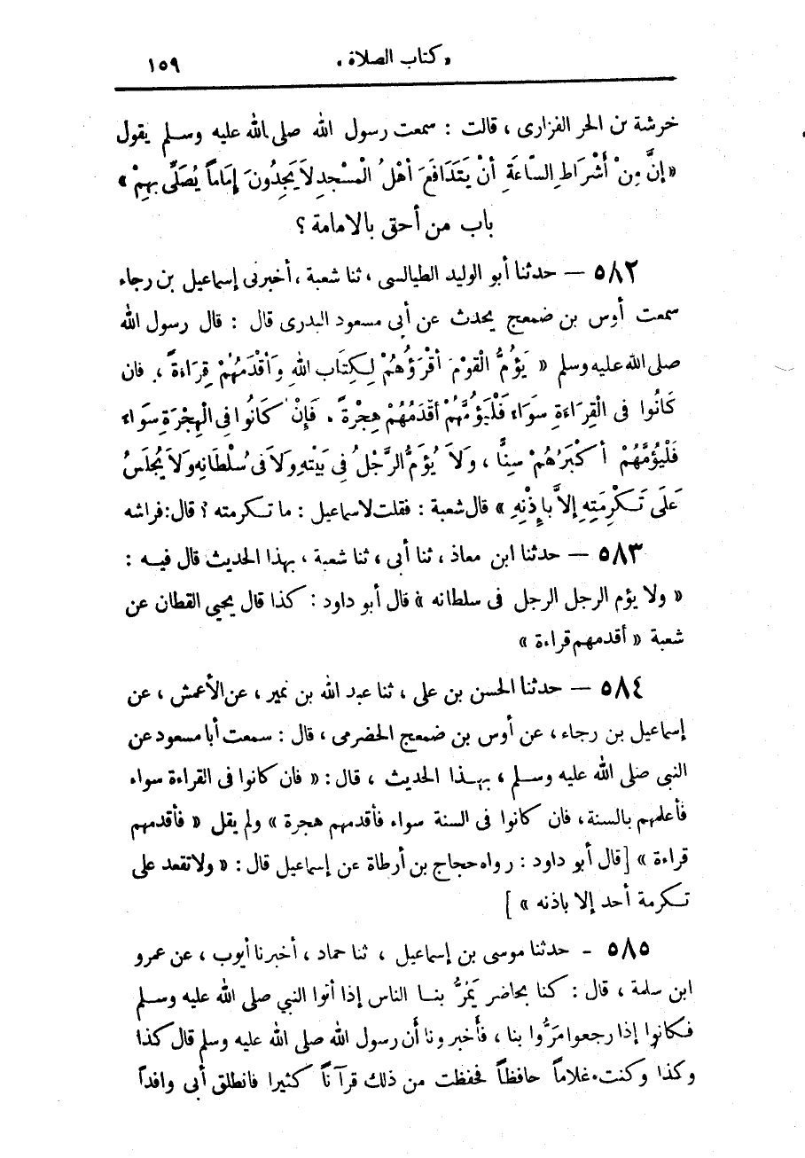 582 - حَدَّثَنَا أَبُو الْوَلِيدِ الطَّيَالِسِيُّ، حَدَّثَنَا شُعْبَةُ، أَخْبَرَنِي إِسْمَاعِيلُ بْنُ رَجَاءٍ، سَمِعْتُ أَوْسَ بْنَ ضَمْعَجٍ يُحَدِّثُ، عَنْ أَبِي مَسْعُودٍ الْبَدْرِيِّ، قَالَ: قَالَ رَسُولُ اللَّهِ صَلَّى اللهُ عَلَيْهِ وَسَلَّمَ: «§يَؤُمُّ الْقَوْمَ أَقْرَؤُهُمْ لِكِتَابِ اللَّهِ وَأَقْدَمُهُمْ قِرَاءَةً فَإِنْ كَانُوا فِي الْقِرَاءَةِ سَوَاءً فَلْيَؤُمَّهُمْ أَقْدَمُهُمْ هِجْرَةً فَإِنْ كَانُوا فِي الْهِجْرَةِ سَوَاءً، فَلْيَؤُمَّهُمْ أَكْبَرُهُمْ سِنًّا وَلَا يُؤَمُّ الرَّجُلُ فِي بَيْتِهِ وَلَا فِي سُلْطَانِهِ وَلَا يُجْلَسُ عَلَى تَكْرِمَتِهِ إِلَّا بِإِذْنِهِ»، قَالَ شُعْبَةُ: فَقُلْتُ لِإِسْمَاعِيلَ: مَا تَكْرِمَتُهُ؟ قَالَ: فِرَاشُهُ.