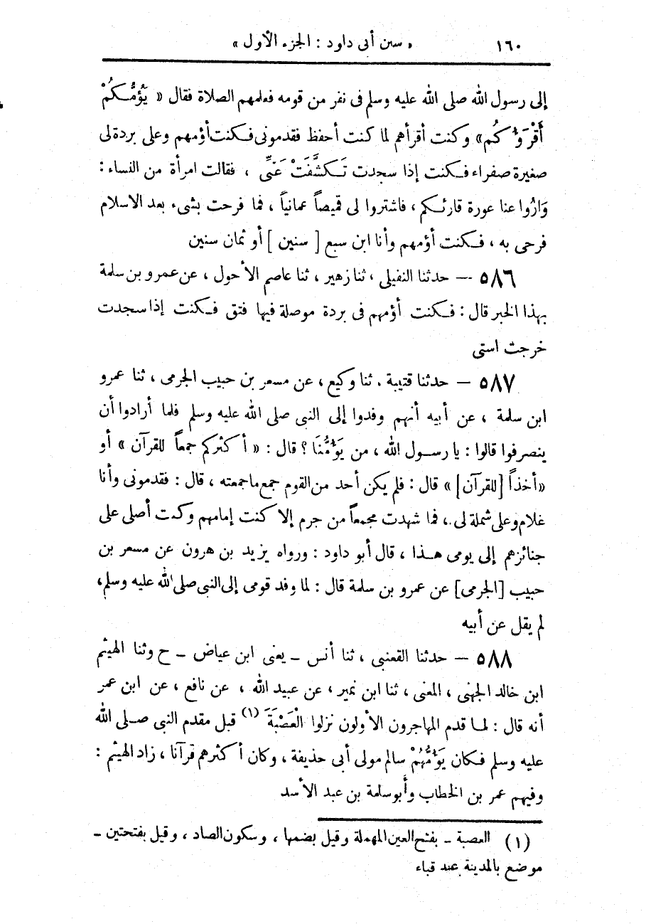 587 - حَدَّثَنَا قُتَيْبَةُ، حَدَّثَنَا وَكِيعٌ، عَنْ مِسْعَرِ بْنِ حَبِيبٍ الْجَرْمِيِّ، حَدَّثَنَا عَمْرُو بْنُ سَلَمَةَ، عَنْ أَبِيهِ، أَنَّهُمْ وَفَدُوا إِلَى النَّبِيِّ صَلَّى اللهُ عَلَيْهِ وَسَلَّمَ فَلَمَّا أَرَادُوا أَنْ يَنْصَرِفُوا، قَالُوا: يَا رَسُولَ اللَّهِ مَنْ يَؤُمُّنَا، قَالَ: «§أَكْثَرُكُمْ جَمْعًا لِلْقُرْآنِ» أَوْ «أَخْذًا لِلْقُرْآنِ» قَالَ: فَلَمْ يَكُنْ أَحَدٌ مِنَ الْقَوْمِ جَمَعَ مَا جَمَعْتُهُ، قَالَ: فَقَدَّمُونِي وَأَنَا غُلَامٌ وَعَلَيَّ شَمْلَةٌ لِي، فَمَا شَهِدْتُ مَجْمَعًا مِنْ جَرْمٍ إِلَّا كُنْتُ إِمَامَهُمْ، وَكُنْتُ أُصَلِّي عَلَى جَنَائِزِهِمْ إِلَى يَوْمِي هَذَا، قَالَ أَبُو دَاوُدَ: وَرَوَاهُ يَزِيدُ بْنُ هَارُونَ، عَنْ مِسْعَرِ بْنِ حَبِيبٍ الْجَرْمِيِّ، عَنْ عَمْرِو بْنِ سَلَمَةَ قَالَ: لَمَّا وَفَدَ قَوْمِي إِلَى النَّبِيِّ صَلَّى اللهُ عَلَيْهِ وَسَلَّمَ لَمْ يَقُلْ عَنْ أَبِيهِ