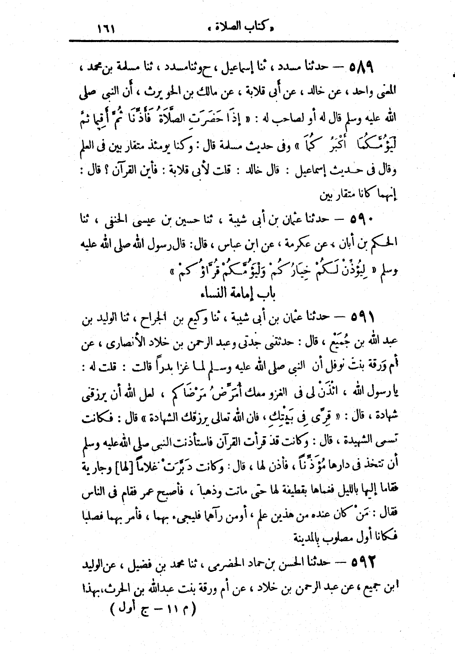 591 - حَدَّثَنَا عُثْمَانُ بْنُ أَبِي شَيْبَةَ، حَدَّثَنَا وَكِيعُ بْنُ الْجَرَّاحِ، حَدَّثَنَا الْوَلِيدُ بْنُ عَبْدِ اللَّهِ بْنِ جُمَيْعٍ، قَالَ: حَدَّثَتْنِي جَدَّتِي، وَعَبْدُ الرَّحْمَنِ بْنُ خَلَّادٍ الْأَنْصَارِيُّ، عَنْ أُمِّ وَرَقَةَ بِنْتِ عَبْدِ اللَّهِ بْنِ نَوْفَلٍ الْأَنْصَارِيَّةِ، أَنَّ النَّبِيَّ صَلَّى اللهُ عَلَيْهِ وَسَلَّمَ لَمَّا غَزَا بَدْرًا، قَالَتْ: قُلْتُ لَهُ: يَا رَسُولَ اللَّهِ، ائْذَنْ لِي فِي الْغَزْوِ مَعَكَ أُمَرِّضُ مَرْضَاكُمْ، لَعَلَّ اللَّهَ أَنْ يَرْزُقَنِي شَهَادَةً، قَالَ: «§قَرِّي فِي بَيْتِكِ فَإِنَّ اللَّهَ تَعَالَى يَرْزُقُكِ الشَّهَادَةَ»، قَالَ: فَكَانَتْ تُسَمَّى الشَّهِيدَةُ، قَالَ: وَكَانَتْ قَدْ قَرَأَتِ الْقُرْآنَ فَاسْتَأْذَنَتِ النَّبِيَّ صَلَّى اللهُ عَلَيْهِ وَسَلَّمَ أَنْ تَتَّخِذَ فِي دَارِهَا مُؤَذِّنًا، فَأَذِنَ لَهَا، قَالَ: وَكَانَتْ قَدْ دَبَّرَتْ غُلَامًا لَهَا وَجَارِيَةً فَقَامَا إِلَيْهَا بِاللَّيْلِ فَغَمَّاهَا بِقَطِيفَةٍ لَهَا حَتَّى مَاتَتْ وَذَهَبَا، فَأَصْبَحَ عُمَرُ فَقَامَ فِي النَّاسِ، فَقَالَ: مَنْ كَانَ عِنْدَهُ مِنْ هَذَيْنِ عِلْمٌ، أَوْ مَنْ رَآهُمَا فَلْيَجِئْ بِهِمَا، فَأَمَرَ بِهِمَا فَصُلِبَا فَكَانَا أَوَّلَ مَصْلُوبٍ بِالْمَدِينَةِ،