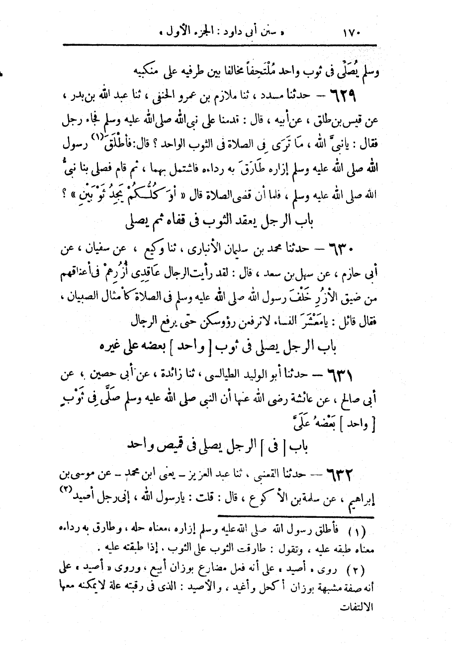 629 - حَدَّثَنَا مُسَدَّدٌ، حَدَّثَنَا مُلَازِمُ بْنُ عَمْرٍو الْحَنَفِيُّ، حَدَّثَنَا عَبْدُ اللَّهِ بْنُ بَدْرٍ، عَنْ قَيْسِ بْنِ طَلْقٍ، عَنْ أَبِيهِ، قَالَ: قَدِمْنَا عَلَى نَبِيِّ اللَّهِ صَلَّى اللهُ عَلَيْهِ وَسَلَّمَ فَجَاءَ رَجُلٌ فَقَالَ: يَا نَبِيَّ اللَّهِ مَا تَرَى فِي الصَّلَاةِ فِي الثَّوْبِ الْوَاحِدِ، قَالَ: فَأَطْلَقَ رَسُولُ اللَّهِ صَلَّى اللهُ عَلَيْهِ وَسَلَّمَ إِزَارَهُ طَارَقَ بِهِ رِدَاءَهُ، فاشْتَمَلَ بِهِمَا، ثُمَّ قَامَ فَصَلَّى بِنَا نَبِيُّ اللَّهِ صَلَّى اللهُ عَلَيْهِ وَسَلَّمَ فَلَمَّا أَنْ قَضَى الصَّلَاةَ، قَالَ: «§أَوَكُلُّكُمْ يَجِدُ ثَوْبَيْنِ؟»