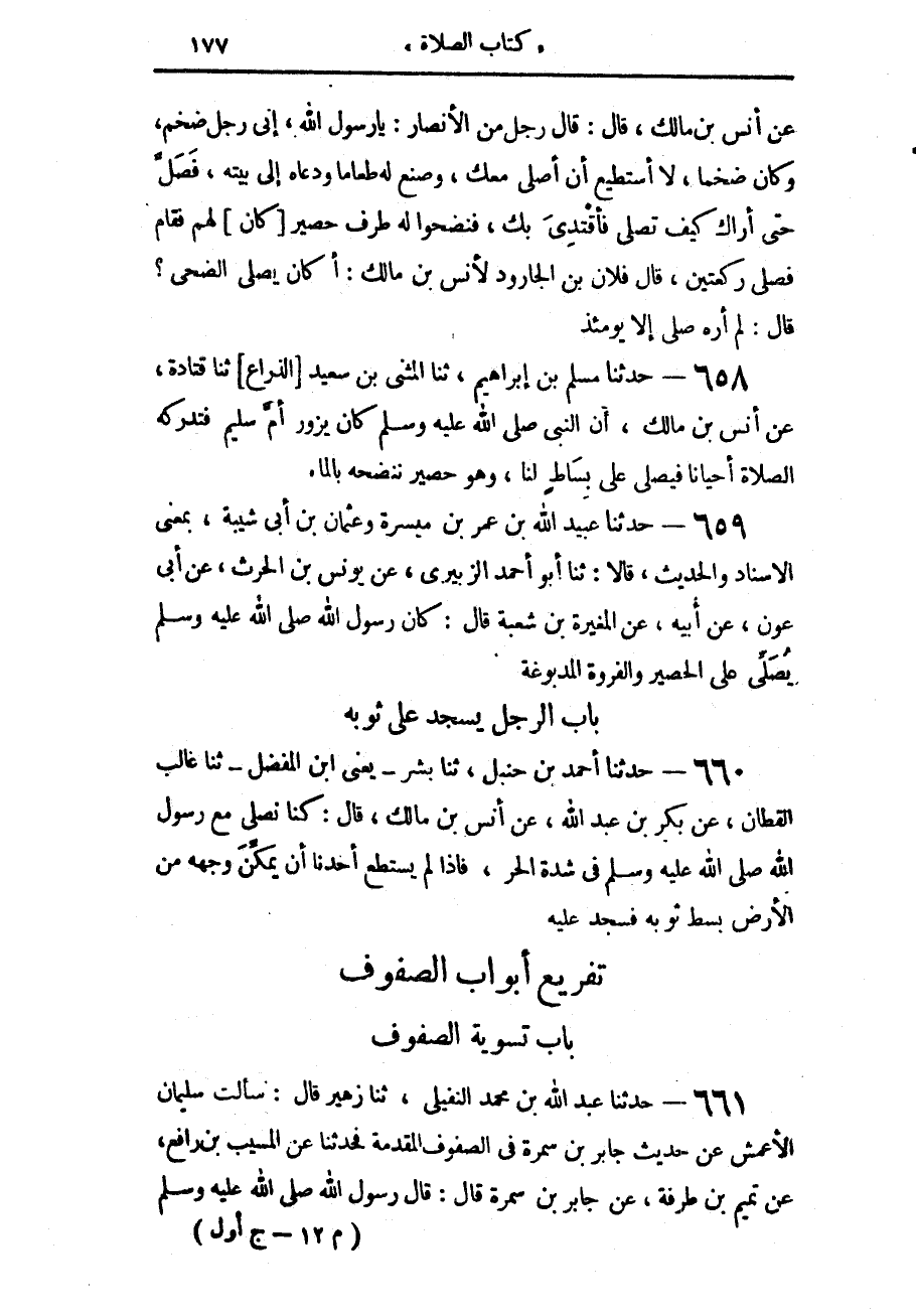 661 - حَدَّثَنَا عَبْدُ اللَّهِ بْنُ مُحَمَّدٍ النُّفَيْلِيُّ، حَدَّثَنَا زُهَيْرٌ، قَالَ: سَأَلْتُ سُلَيْمَانَ الْأَعْمَشَ - عَنْ حَدِيثِ جَابِرِ بْنِ سَمُرَة فِي الصُّفُوفِ الْمُقَدَّمَةِ، فَحَدَّثَنَا عَنِ الْمُسَيَّبِ بْنِ رَافِعٍ، عَنْ تَمِيمِ بْنِ طَرَفَةَ، عَنْ جَابِرِ بْنِ سَمُرَةَ، قَالَ: قَالَ رَسُولُ اللَّهِ صَلَّى اللهُ عَلَيْهِ وَسَلَّمَ -[178]-: «أَلَا تَصُفُّونَ كَمَا تَصُفُّ الْمَلَائِكَةُ عِنْدَ رَبِّهِمْ جَلَّ وَعَزَّ»، قُلْنَا وَكَيْفَ تَصُفُّ الْمَلَائِكَةُ عِنْدَ رَبِّهِمْ؟، قَالَ: «§يُتِمُّونَ الصُّفُوفَ الْمُقَدَّمَةَ وَيَتَرَاصُّونَ فِي الصَّفِّ»
