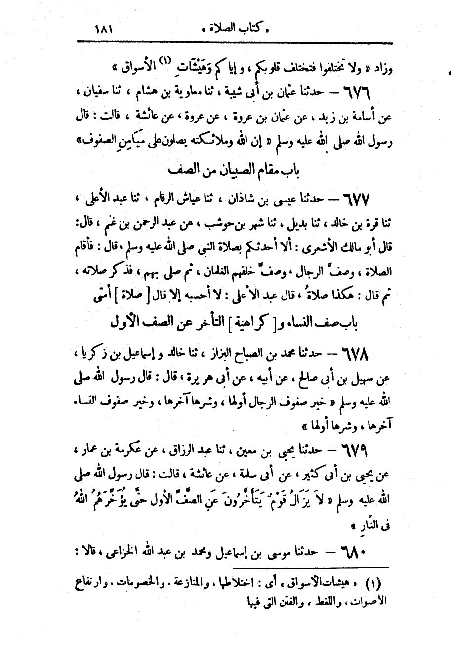 678 - حَدَّثَنَا مُحَمَّدُ بْنُ الصَّبَّاحِ الْبَزَّازُ، حَدَّثَنَا خَالِدٌ، وَإِسْمَاعِيلُ بْنُ زَكَرِيَّاءَ، عَنْ سُهَيْلِ بْنِ أَبِي صَالِحٍ، عَنْ أَبِيهِ، عَنْ أَبِي هُرَيْرَةَ، قَالَ: قَالَ رَسُولُ اللَّهِ صَلَّى اللهُ عَلَيْهِ وَسَلَّمَ: «§خَيْرُ صُفُوفِ الرِّجَالِ أَوَّلُهَا وَشَرُّهَا آخِرُهَا، وَخَيْرُ صُفُوفِ النِّسَاءِ آخِرُهَا وَشَرُّهَا أَوَّلُهَا»