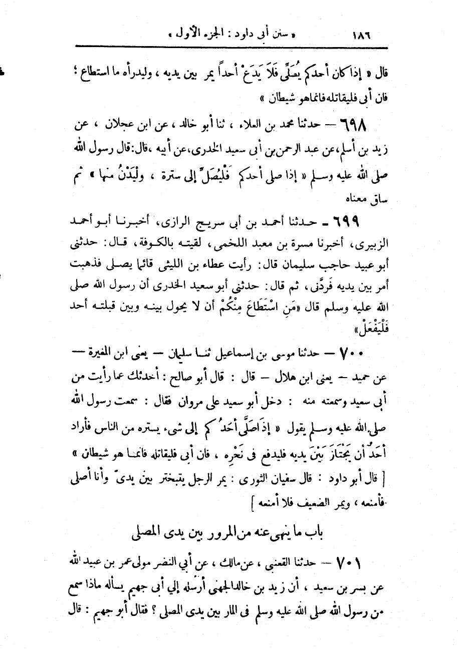 700 - حَدَّثَنَا مُوسَى بْنُ إِسْمَاعِيلَ، حَدَّثَنَا سُلَيْمَانُ يَعْنِي ابْنَ الْمُغِيرَةِ، عَنْ حُمَيْدٍ يَعْنِي ابْنَ هِلَالٍ، قَالَ: قَالَ أَبُو صَالِحٍ: أُحَدِّثُكَ عَمَّا رَأَيْتُ مِنْ أَبِي سَعِيدٍ، وَسَمِعْتُهُ مِنْهُ دَخَلَ أَبُو سَعِيدٍ عَلَى مَرْوَانَ، فَقَالَ: سَمِعْتُ رَسُولَ اللَّهِ صَلَّى اللهُ عَلَيْهِ وَسَلَّمَ يَقُولُ: «§إِذَا صَلَّى أَحَدُكُمْ إِلَى شَيْءٍ يَسْتُرُهُ مِنَ النَّاسِ فَأَرَادَ أَحَدٌ أَنْ يَجْتَازَ بَيْنَ يَدَيْهِ فَلْيَدْفَعْ فِي نَحْرِهِ فَإِنْ أَبَى فَلْيُقَاتِلْهُ فَإِنَّمَا هُوَ الشَّيْطَانُ» قَالَ أَبُو دَاوُدَ: قَالَ سُفْيَانُ الثَّوْرِيُّ: يَمُرُّ الرَّجُلُ يَتَبَخْتَرُ بَيْنَ يَدَيَّ وَأَنَا أُصَلِّي فَأَمْنَعُهُ وَيَمُرُّ الضَّعِيفُ فَلَا أَمْنَعُهُ