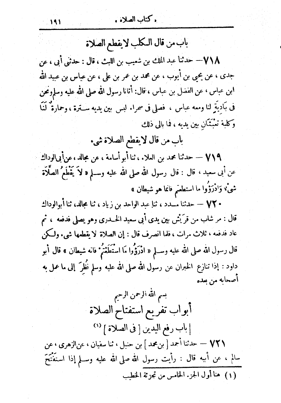 719 - حَدَّثَنَا مُحَمَّدُ بْنُ الْعَلَاءِ، حَدَّثَنَا أَبُو أُسَامَةَ، عَنْ مُجَالِدٍ، عَنْ أَبِي الْوَدَّاكِ، عَنْ أَبِي سَعِيدٍ، قَالَ: قَالَ رَسُولُ اللَّهِ صَلَّى اللهُ عَلَيْهِ وَسَلَّمَ: «§لَا يَقْطَعُ الصَّلَاةَ شَيْءٌ وَادْرَءُوا مَا اسْتَطَعْتُمْ فَإِنَّمَا هُوَ شَيْطَانٌ»
