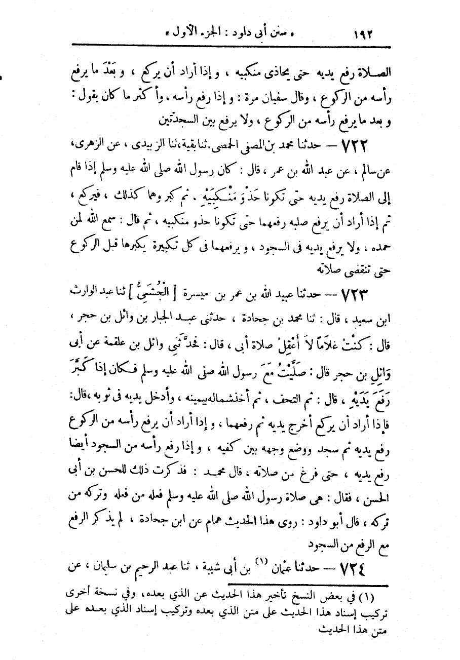 723 - حَدَّثَنَا عُبَيْدُ اللَّهِ بْنُ عُمَرَ بْنِ مَيْسَرَةَ الْجُشَمِيُّ، حَدَّثَنَا عَبْدُ الْوَارِثِ بْنُ سَعِيدٍ، قَالَ: حَدَّثَنَا مُحَمَّدُ بْنُ جُحَادَةَ، حَدَّثَنِي عَبْدُ الْجَبَّارِ بْنُ وَائِلِ بْنِ حُجْرٍ، قَالَ: كُنْتُ غُلَامًا لَا أَعْقِلُ صَلَاةَ أَبِي قَالَ: فَحَدَّثَنِي وَائِلُ بْنُ عَلْقَمَةَ، عَنْ أَبِي وَائِلِ بْنِ حُجْرٍ، قَالَ: صَلَّيْتُ مَعَ رَسُولِ اللَّهِ صَلَّى اللهُ عَلَيْهِ وَسَلَّمَ فَكَانَ " §إِذَا كَبَّرَ رَفَعَ يَدَيْهِ، قَالَ: ثُمَّ الْتَحَفَ، ثُمَّ أَخَذَ شِمَالَهُ بِيَمِينِهِ وَأَدْخَلَ يَدَيْهِ فِي ثَوْبِهِ قَالَ: فَإِذَا أَرَادَ أَنْ يَرْكَعَ أَخْرَجَ يَدَيْهِ ثُمَّ رَفَعَهُمَا، وَإِذَا أَرَادَ أَنْ يَرْفَعَ رَأْسَهُ مِنَ الرُّكُوعِ رَفَعَ يَدَيْهِ ثُمَّ سَجَدَ وَوَضَعَ وَجْهَهُ بَيْنَ كَفَّيْهِ، وَإِذَا رَفَعَ رَأْسَهُ مِنَ السُّجُودِ أَيْضًا رَفَعَ يَدَيْهِ حَتَّى فَرَغَ مِنْ صَلَاتِهِ "، قَالَ: مُحَمَّدٌ: فَذَكَرْتُ ذَلِكَ لِلْحَسَنِ بْنِ أَبِي الْحَسَنِ، فَقَالَ: هِيَ صَلَاةُ رَسُولِ اللَّهِ صَلَّى اللهُ عَلَيْهِ وَسَلَّمَ فَعَلَهُ مَنْ فَعَلَهُ وَتَرَكَهُ مَنْ تَرَكَهُ، قَالَ أَبُو دَاوُدَ: رَوَى هَذَا الْحَدِيثَ هَمَّامٌ، عَنِ ابْنِ جُحَادَةَ لَمْ يَذْكُرِ الرَّفْعَ مَعَ الرَّفْعِ مِنَ السُّجُودِ