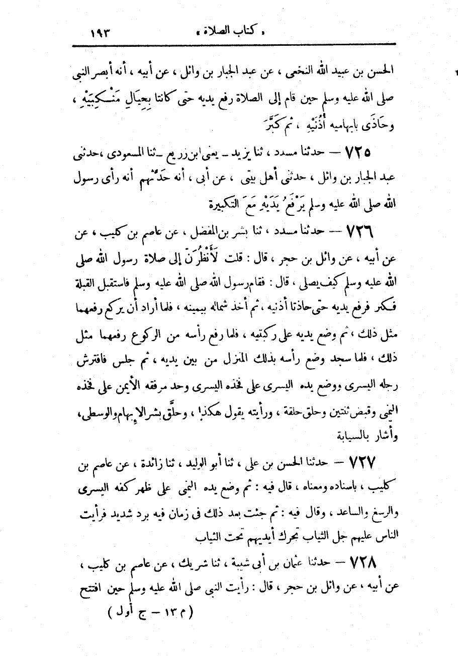 728 - حَدَّثَنَا عُثْمَانُ بْنُ أَبِي شَيْبَةَ، حَدَّثَنَا شَرِيكٌ، عَنْ عَاصِمِ بْنِ كُلَيْبٍ، عَنْ أَبِيهِ، عَنْ وَائِلِ بْنِ حُجْرٍ، قَالَ: رَأَيْتُ النَّبِيَّ صَلَّى اللهُ عَلَيْهِ وَسَلَّمَ «§حِينَ افْتَتَحَ -[194]- الصَّلَاةَ رَفَعَ يَدَيْهِ حِيَالَ أُذُنَيْهِ»، قَالَ: ثُمَّ أَتَيْتُهُمْ فَرَأَيْتُهُمْ يَرْفَعُونَ أَيْدِيَهُمْ إِلَى صُدُورِهِمْ فِي افْتِتَاحِ الصَّلَاةِ وَعَلَيْهِمْ بَرَانِسُ وَأَكْسِيَةٌ
