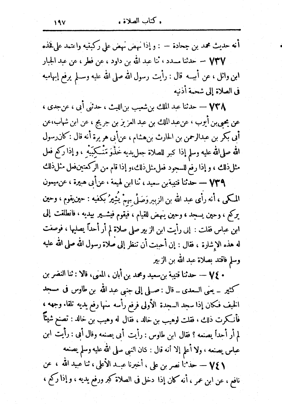 739 - حَدَّثَنَا قُتَيْبَةُ بْنُ سَعِيدٍ، حَدَّثَنَا ابْنُ لَهِيعَةَ، عَنْ أَبِي هُبَيْرَةَ، عَنْ مَيْمُونٍ الْمَكِّيِّ، أَنَّهُ رَأَى عَبْدَ اللَّهِ بْنَ الزُّبَيْرِ، «§وَصَلَّى بِهِمْ يُشِيرُ بِكَفَّيْهِ حِينَ يَقُومُ وَحِينَ يَرْكَعُ وَحِينَ يَسْجُدُ وَحِينَ يَنْهَضُ لِلْقِيَامِ، فَيَقُومُ فَيُشِيرُ بِيَدَيْهِ» فَانْطَلَقْتُ إِلَى ابْنِ عَبَّاسٍ، فَقُلْتُ إِنِّي رَأَيْتُ ابْنَ الزُّبَيْرِ صَلَّى صَلَاةً لَمْ أَرَ أَحَدًا يُصَلِّيهَا فَوَصَفْتُ لَهُ هَذِهِ الْإِشَارَةَ، فَقَالَ: إِنْ أَحْبَبْتَ أَنْ تَنْظُرَ إِلَى صَلَاةِ رَسُولِ اللَّهِ صَلَّى اللهُ عَلَيْهِ وَسَلَّمَ فَاقْتَدِ بِصَلَاةِ عَبْدِ اللَّهِ بْنِ الزُّبَيْرِ