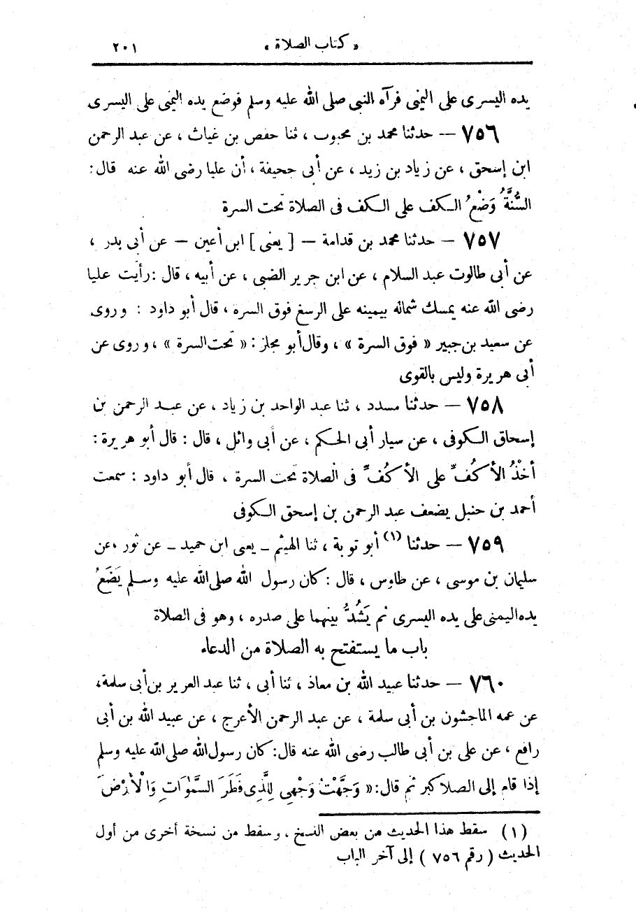 757 - حَدَّثَنَا مُحَمَّدُ بْنُ قُدَامَةَ يَعْنِي ابْنَ أَعْيَنَ، عَنْ أَبِي بَدْرٍ، عَنْ أَبِي طَالُوتَ عَبْدِ السَّلَامِ، عَنِ ابْنِ جَرِيرٍ الضَّبِّيِّ، عَنْ أَبِيهِ، قَالَ: «رَأَيْتُ عَلِيًّا، رَضِيَ اللَّهُ عَنْهُ §يُمْسِكُ شِمَالَهُ بِيَمِينِهِ عَلَى الرُّسْغِ فَوْقَ السُّرَّةِ»، قَالَ أَبُو دَاوُدَ: وَرُوِيَ عَنْ سَعِيدِ بْنِ جُبَيْرٍ، فَوْقَ السُّرَّةِ قَالَ أَبُو مِجْلَزٍ: تَحْتَ السُّرَّةِ وَرُوِيَ عَنْ أَبِي هُرَيْرَةَ وَلَيْسَ بِالْقَوِيِّ