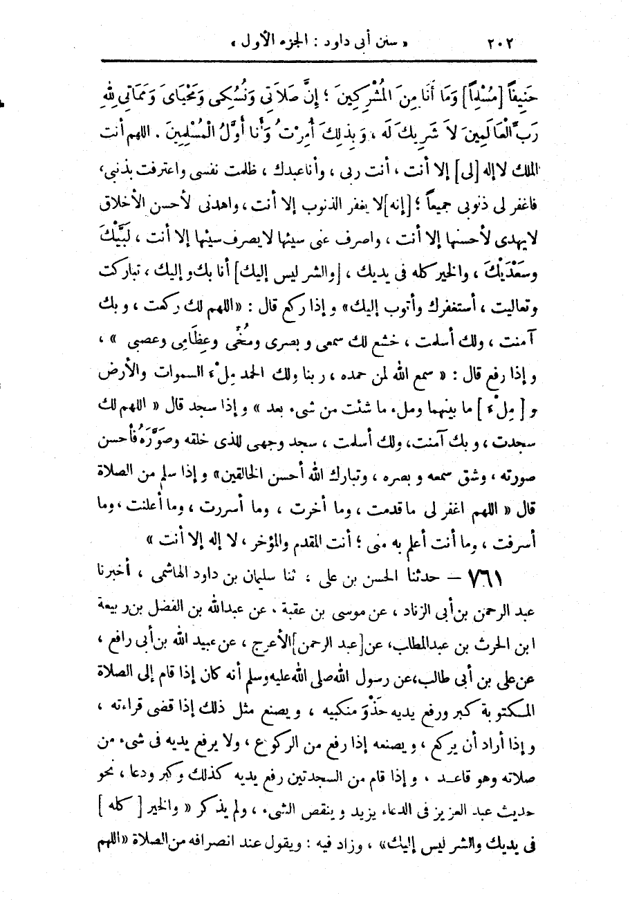 761 - حَدَّثَنَا الْحَسَنُ بْنُ عَلِيٍّ، حَدَّثَنَا سُلَيْمَانُ بْنُ دَاوُدَ الْهَاشِمِيُّ، أَخْبَرَنَا عَبْدُ الرَّحْمَنِ بْنُ أَبِي الزِّنَادِ، عَنْ مُوسَى بْنِ عُقْبَةَ، عَنْ عَبْدِ اللَّهِ بْنِ الْفَضْلِ بْنِ رَبِيعَةَ بْنِ الْحَارِثِ بْنِ عَبْدِ الْمُطَّلِبِ، عَنْ عَبْدِ الرَّحْمَنِ الْأَعْرَجِ، عَنْ عُبَيْدِ اللَّهِ بْنِ أَبِي رَافِعٍ، عَنْ عَلِيِّ بْنِ أَبِي طَالِبٍ، عَنْ رَسُولِ اللَّهِ صَلَّى اللهُ عَلَيْهِ وَسَلَّمَ أَنَّهُ §كَانَ إِذَا قَامَ إِلَى الصَّلَاةِ الْمَكْتُوبَةِ كَبَّرَ وَرَفَعَ يَدَيْهِ حَذْوَ مَنْكِبَيْهِ، وَيَصْنَعُ مِثْلَ ذَلِكَ إِذَا قَضَى قِرَاءَتَهُ وَإِذَا أَرَادَ أَنْ يَرْكَعَ، وَيَصْنَعُهُ إِذَا رَفَعَ مِنَ الرُّكُوعِ وَلَا يَرْفَعُ يَدَيْهِ فِي شَيْءٍ مِنْ صَلَاتِهِ وَهُوَ قَاعِدٌ، وَإِذَا قَامَ مِنَ السَّجْدَتَيْنِ رَفَعَ يَدَيْهِ كَذَلِكَ وَكَبَّرَ وَدَعَا، نَحْوَ حَدِيثِ عَبْدِ الْعَزِيزِ فِي الدُّعَاءِ يَزِيدُ وَيَنْقُصُ الشَّيْءَ وَلَمْ يَذْكُرْ وَالْخَيْرُ كُلُّهُ فِي يَدَيْكَ وَالشَّرُّ لَيْسَ إِلَيْكَ "، وَزَادَ فِيهِ، وَيَقُولُ: عِنْدَ انْصِرَافِهِ مِنَ الصَّلَاةِ: «اللَّهُمَّ -[203]- اغْفِرْ لِي مَا قَدَّمْتُ وَمَا أَخَّرْتُ وَمَا أَسْرَرْتُ وَأَعْلَنْتُ أَنْتَ إِلَهِي لَا إِلَهَ إِلَّا أَنْتَ»،