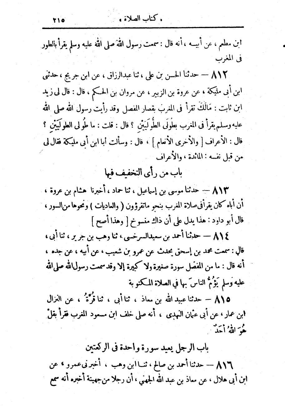 812 - حَدَّثَنَا الْحَسَنُ بْنُ عَلِيٍّ، حَدَّثَنَا عَبْدُ الرَّزَّاقِ، عَنِ ابْنِ جُرَيْجٍ، حَدَّثَنِي ابْنُ أَبِي مُلَيْكَةَ، عَنْ عُرْوَةَ بْنِ الزُّبَيْرِ، عَنْ مَرْوَانَ بْنِ الْحَكَمِ، قَالَ: قَالَ لِي زَيْدُ بْنُ ثَابِتٍ: مَا لَكَ تَقْرَأُ فِي الْمَغْرِبِ بِقِصَارِ الْمُفَصَّلِ وَقَدْ رَأَيْتُ رَسُولَ اللَّهِ صَلَّى اللهُ عَلَيْهِ وَسَلَّمَ «§يَقْرَأُ فِي الْمَغْرِبِ بِطُولَى الطُّولَيَيْنِ»، قَالَ: قُلْتُ: مَا طُولَى الطُّولَيَيْنِ؟ قَالَ: الْأَعْرَافُ وَالْأُخْرَى الْأَنْعَامُ، قَالَ: وَسَأَلْتُ أَنَا ابْنَ أَبِي مُلَيْكَةَ، فَقَالَ لِي: مِنْ قِبَلِ نَفْسِهِ الْمَائِدَةُ وَالْأَعْرَافُ