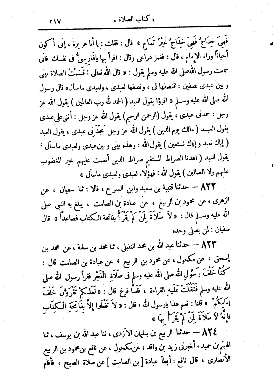 823 - حَدَّثَنَا عَبْدُ اللَّهِ بْنُ مُحَمَّدٍ النُّفَيْلِيُّ، حَدَّثَنَا مُحَمَّدُ بْنُ سَلَمَةَ، عَنْ مُحَمَّدِ بْنِ إِسْحَاقَ، عَنْ مَكْحُولٍ، عَنْ مَحْمُودِ بْنِ الرَّبِيعِ، عَنْ عُبَادَةَ بْنِ الصَّامِتِ، قَالَ: كُنَّا خَلْفَ رَسُولِ اللَّهِ صَلَّى اللهُ عَلَيْهِ وَسَلَّمَ فِي صَلَاةِ الْفَجْرِ فَقَرَأَ رَسُولُ اللَّهِ صَلَّى اللهُ عَلَيْهِ وَسَلَّمَ، فَثَقُلَتْ عَلَيْهِ الْقِرَاءَةُ، فَلَمَّا فَرَغَ قَالَ: «لَعَلَّكُمْ تَقْرَءُونَ خَلْفَ إِمَامِكُمْ» قُلْنَا: نَعَمْ هَذًّا يَا رَسُولَ اللَّهِ، قَالَ: «§لَا تَفْعَلُوا إِلَّا بِفَاتِحَةِ الْكِتَابِ فَإِنَّهُ لَا صَلَاةَ لِمَنْ لَمْ يَقْرَأْ بِهَا»
