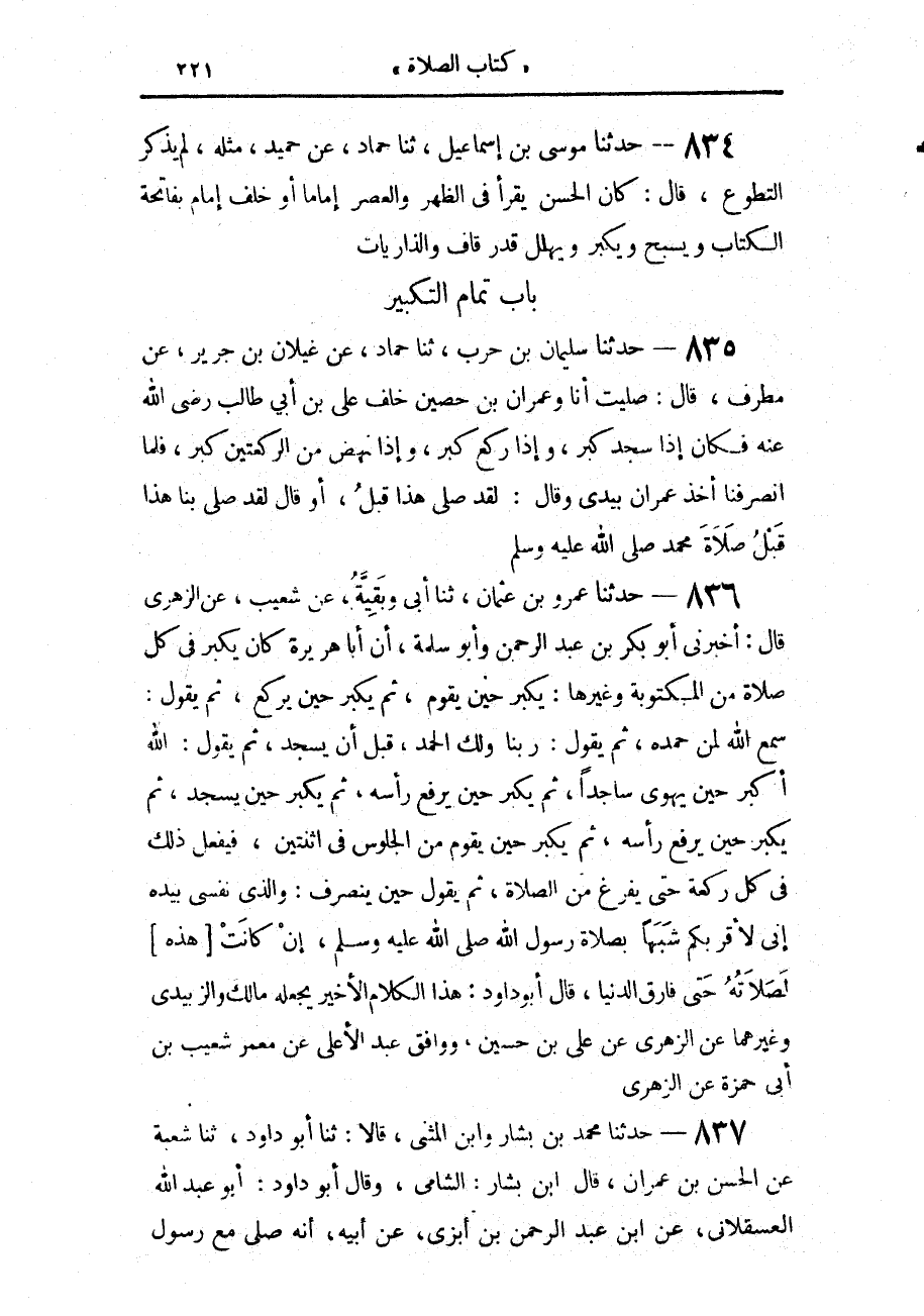 835 - حَدَّثَنَا سُلَيْمَانُ بْنُ حَرْبٍ، حَدَّثَنَا حَمَّادٌ، عَنْ غَيْلَانَ بْنِ جَرِيرٍ، عَنْ مُطَرِّفٍ، قَالَ: صَلَّيْتُ أَنَا وَعِمْرَانُ بْنُ حُصَيْنٍ، خَلْفَ عَلِيِّ بْنِ أَبِي طَالِبٍ رَضِيَ اللَّهُ عَنْهُ فَكَانَ «§إِذَا سَجَدَ كَبَّرَ وَإِذَا رَكَعَ كَبَّرَ، وَإِذَا نَهَضَ مِنَ الرَّكْعَتَيْنِ كَبَّرَ»، فَلَمَّا انْصَرَفْنَا أَخَذَ عِمْرَانُ بِيَدِي وَقَالَ: لَقَدْ صَلَّى هَذَا قَبْلُ - أَوْ قَالَ: لَقَدْ صَلَّى بِنَا هَذَا قَبْلُ - صَلَاةِ مُحَمَّدٍ صَلَّى اللهُ عَلَيْهِ وَسَلَّمَ
