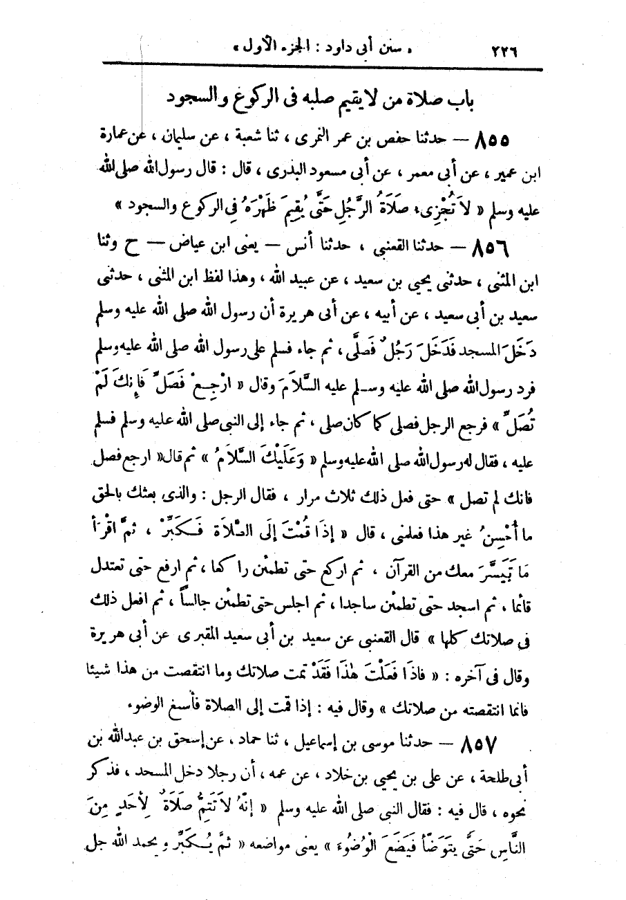 855 - حَدَّثَنَا حَفْصُ بْنُ عُمَرَ النَّمَرِيُّ، حَدَّثَنَا شُعْبَةُ، عَنْ سُلَيْمَانَ، عَنْ عُمَارَةَ بْنِ عُمَيْرٍ، عَنْ أَبِي مَعْمَرٍ، عَنْ أَبِي مَسْعُودٍ الْبَدْرِيِّ، قَالَ: قَالَ رَسُولُ اللَّهِ صَلَّى اللهُ عَلَيْهِ وَسَلَّمَ: «§لَا تُجْزِئُ صَلَاةُ الرَّجُلِ حَتَّى يُقِيمَ ظَهْرَهُ فِي الرُّكُوعِ وَالسُّجُودِ»