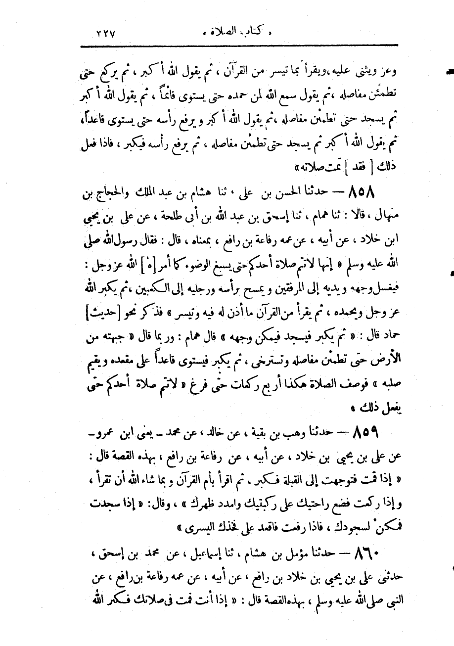 858 - حَدَّثَنَا الْحَسَنُ بْنُ عَلِيٍّ، حَدَّثَنَا هِشَامُ بْنُ عَبْدِ الْمَلِكِ، وَالْحَجَّاجُ بْنُ مِنْهَالٍ، قَالَا: حَدَّثَنَا هَمَّامٌ، حَدَّثَنَا إِسْحَاقُ بْنُ عَبْدِ اللَّهِ بْنِ أَبِي طَلْحَةَ، عَنْ عَلِيِّ بْنِ يَحْيَى بْنِ خَلَّادٍ، عَنْ أَبِيهِ، عَنْ عَمِّهِ رِفَاعَةَ بْنِ رَافِعٍ، بِمَعْنَاهُ، قَالَ: فَقَالَ رَسُولُ اللَّهِ صَلَّى اللهُ عَلَيْهِ وَسَلَّمَ: «إِنَّهَا §لَا تَتِمُّ صَلَاةُ أَحَدِكُمْ حَتَّى يُسْبِغَ الْوُضُوءَ كَمَا أَمَرَهُ اللَّهُ عَزَّ وَجَلَّ، فَيَغْسِلَ وَجْهَهُ وَيَدَيْهِ إِلَى الْمِرْفَقَيْنِ، وَيَمْسَحَ بِرَأْسِهِ وَرِجْلَيْهِ إِلَى الْكَعْبَيْنِ، ثُمَّ يُكَبِّرَ اللَّهَ عَزَّ وَجَلَّ وَيَحْمَدَهُ، ثُمَّ يَقْرَأَ مِنَ الْقُرْآنِ مَا أَذِنَ لَهُ فِيهِ وَتَيَسَّرَ»، فَذَكَرَ نَحْوَ حَدِيثِ حَمَّادٍ، قَالَ: " ثُمَّ يُكَبِّرَ فَيَسْجُدَ فَيُمَكِّنَ وَجْهَهُ - قَالَ هَمَّامٌ: وَرُبَّمَا قَالَ: جَبْهَتَهُ مِنَ الْأَرْضِ - حَتَّى تَطْمَئِنَّ مَفَاصِلُهُ وَتَسْتَرْخِيَ، ثُمَّ يُكَبِّرَ فَيَسْتَوِيَ قَاعِدًا عَلَى مَقْعَدِهِ وَيُقِيمَ صُلْبَهُ "، فَوَصَفَ الصَّلَاةَ هَكَذَا أَرْبَعَ رَكَعَاتٍ حَتَّى تَفْرُغَ، لَا تَتِمُّ صَلَاةُ أَحَدِكُمْ حَتَّى يَفْعَلَ ذَلِكَ