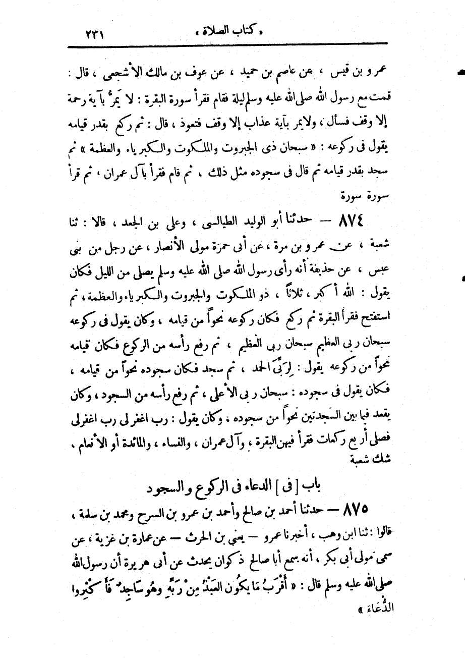 874 - حَدَّثَنَا أَبُو الْوَلِيدِ الطَّيَالِسِيُّ، وَعَلِيُّ بْنُ الْجَعْدِ، قَالَا: حَدَّثَنَا شُعْبَةُ، عَنْ عَمْرِو بْنِ مُرَّةَ، عَنْ أَبِي حَمْزَةَ، مَوْلَى الْأَنْصَارِ، عَنْ رَجُلٍ مِنْ بَنِي عَبْسٍ، عَنْ حُذَيْفَةَ، أَنَّهُ رَأَى رَسُولَ اللَّهِ صَلَّى اللهُ عَلَيْهِ وَسَلَّمَ §يُصَلِّي مِنَ اللَّيْلِ، فَكَانَ يَقُولُ: «اللَّهُ أَكْبَرُ - ثَلَاثًا - ذُو الْمَلَكُوتِ وَالْجَبَرُوتِ وَالْكِبْرِيَاءِ وَالْعَظَمَةِ»، ثُمَّ اسْتَفْتَحَ فَقَرَأَ الْبَقَرَةَ، ثُمَّ رَكَعَ فَكَانَ رُكُوعُهُ نَحْوًا مِنْ قِيَامِهِ، وَكَانَ يَقُولُ فِي رُكُوعِهِ: «سُبْحَانَ رَبِّيَ الْعَظِيمِ، سُبْحَانَ رَبِّيَ الْعَظِيمِ»، ثُمَّ رَفَعَ رَأْسَهُ مِنَ الرُّكُوعِ، فَكَانَ قِيَامُهُ نَحْوًا مِنْ رُكُوعِهِ، يَقُولُ: لِرَبِّيَ الْحَمْدُ، ثُمَّ سَجَدَ، فَكَانَ سُجُودُهُ نَحْوًا مِنْ قِيَامِهِ، فَكَانَ يَقُولُ فِي سُجُودِهِ: «سُبْحَانَ رَبِّيَ الْأَعْلَى»، ثُمَّ رَفَعَ رَأْسَهُ مِنَ السُّجُودِ، وَكَانَ يَقْعُدُ فِيمَا بَيْنَ السَّجْدَتَيْنِ نَحْوًا مِنْ سُجُودِهِ، وَكَانَ يَقُولُ: «رَبِّ اغْفِرْ لِي، رَبِّ اغْفِرْ لِي»، فَصَلَّى أَرْبَعَ رَكَعَاتٍ، فَقَرَأَ فِيهِنَّ الْبَقَرَةَ، وَآلَ عِمْرَانَ، وَالنِّسَاءَ، وَالْمَائِدَةَ، أَوِ الْأَنْعَامَ، شَكَّ شُعْبَةُ