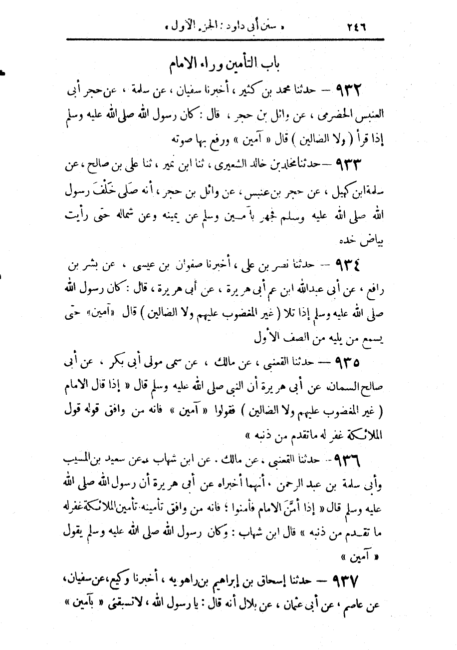932 - حَدَّثَنَا مُحَمَّدُ بْنُ كَثِيرٍ، أَخْبَرَنَا سُفْيَانُ، عَنْ سَلَمَةَ، عَنْ حُجْرٍ أَبِي الْعَنْبَسِ الْحَضْرَمِيِّ، عَنْ وَائِلِ بْنِ حُجْرٍ، قَالَ: كَانَ رَسُولُ اللَّهِ صَلَّى اللهُ عَلَيْهِ وَسَلَّمَ §إِذَا قَرَأَ {وَلَا الضَّالِّينَ} [الفاتحة: 7]، قَالَ: «آمِينَ»، وَرَفَعَ بِهَا صَوْتَهُ
