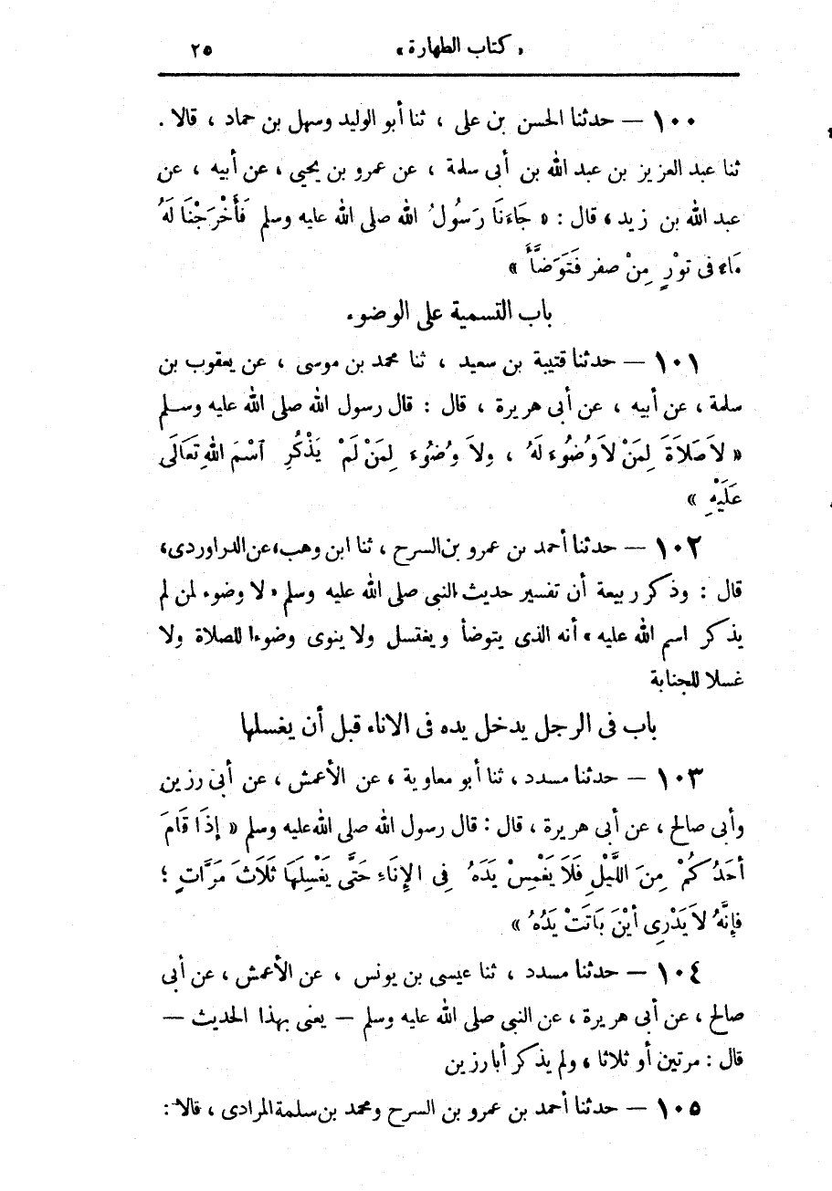 102 - حَدَّثَنَا أَحْمَدُ بْنُ عَمْرِو بْنِ السَّرْحِ، حَدَّثَنَا ابْنُ وَهْبٍ، عَنِ الدَّرَاوَرْدِيِّ، قَالَ: وَذَكَرَ رَبِيعَةُ، أَنَّ تَفْسِيرَ حَدِيثِ النَّبِيِّ صَلَّى اللهُ عَلَيْهِ وَسَلَّمَ: «§لَا وُضُوءَ لِمَنْ لَمْ يَذْكُرِ اسْمَ اللَّهِ عَلَيْهِ» أَنَّهُ الَّذِي يَتَوَضَّأُ وَيَغْتَسِلُ، وَلَا يَنْوِي وُضُوءًا لِلصَّلَاةِ، وَلَا غُسْلًا لِلْجَنَابَةِ