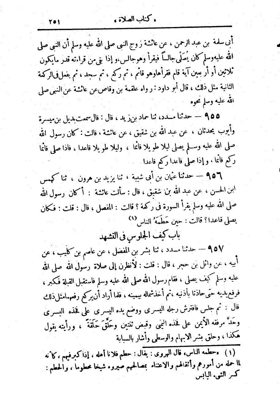 955 - حَدَّثَنَا مُسَدَّدٌ، حَدَّثَنَا حَمَّادُ بْنُ زَيْدٍ، قَالَ: قَالَ: سَمِعْتُ بُدَيْلَ بْنَ مَيْسَرَةَ، وَأَيُّوبَ، يُحَدِّثَانِ عَنْ عَبْدِ اللَّهِ بْنِ شَقِيقٍ، عَنْ عَائِشَةَ، قَالَتْ: «كَانَ رَسُولُ اللَّهِ صَلَّى اللهُ عَلَيْهِ وَسَلَّمَ §يُصَلِّي لَيْلًا طَوِيلًا قَائِمًا، وَلَيْلًا طَوِيلًا قَاعِدًا، فَإِذَا صَلَّى قَائِمًا، رَكَعَ قَائِمًا، وَإِذَا صَلَّى قَاعِدًا، رَكَعَ قَاعِدًا»