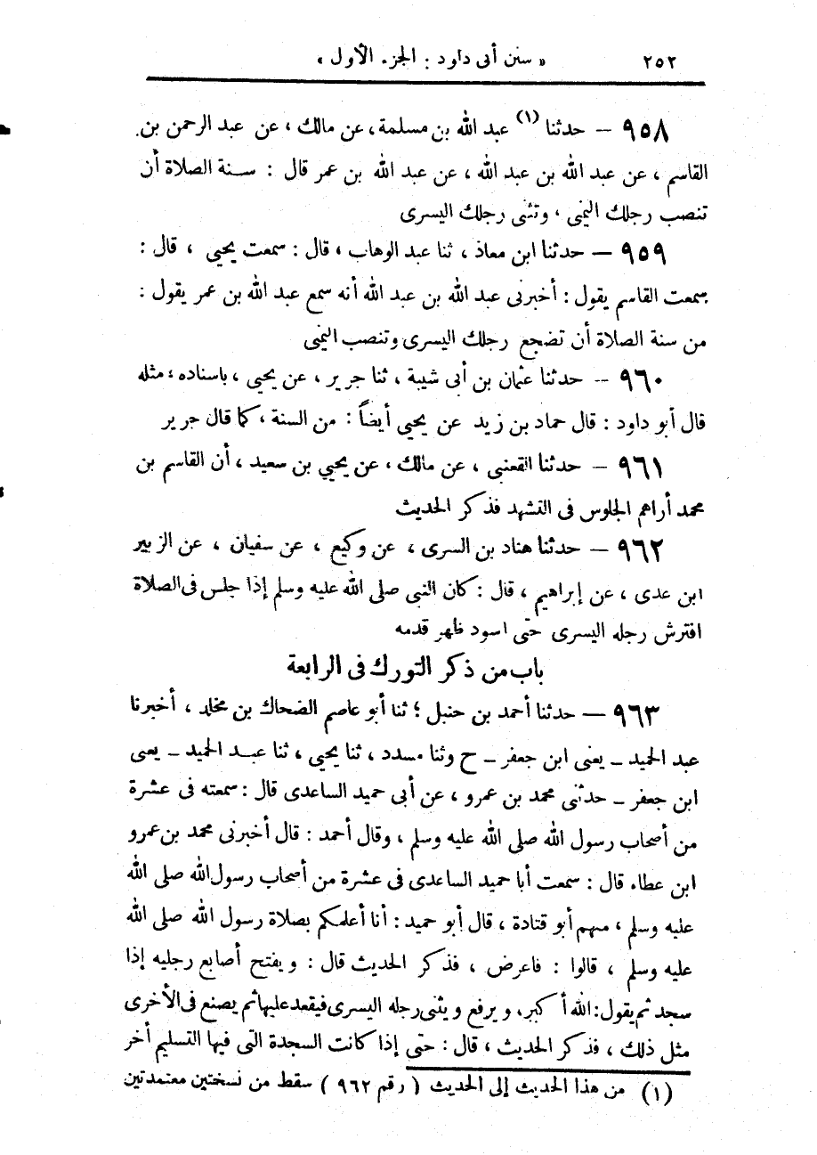 962 - حَدَّثَنَا هَنَّادُ بْنُ السَّرِيِّ، عَنْ وَكِيعٍ، عَنْ سُفْيَانَ، عَنِ الزُّبَيْرِ بْنِ عَدِيٍّ، عَنْ إِبْرَاهِيمَ، قَالَ: «كَانَ النَّبِيُّ صَلَّى اللهُ عَلَيْهِ وَسَلَّمَ §إِذَا جَلَسَ فِي الصَّلَاةِ، افْتَرَشَ رِجْلَهُ الْيُسْرَى حَتَّى اسْوَدَّ ظَهْرُ قَدَمِهِ»