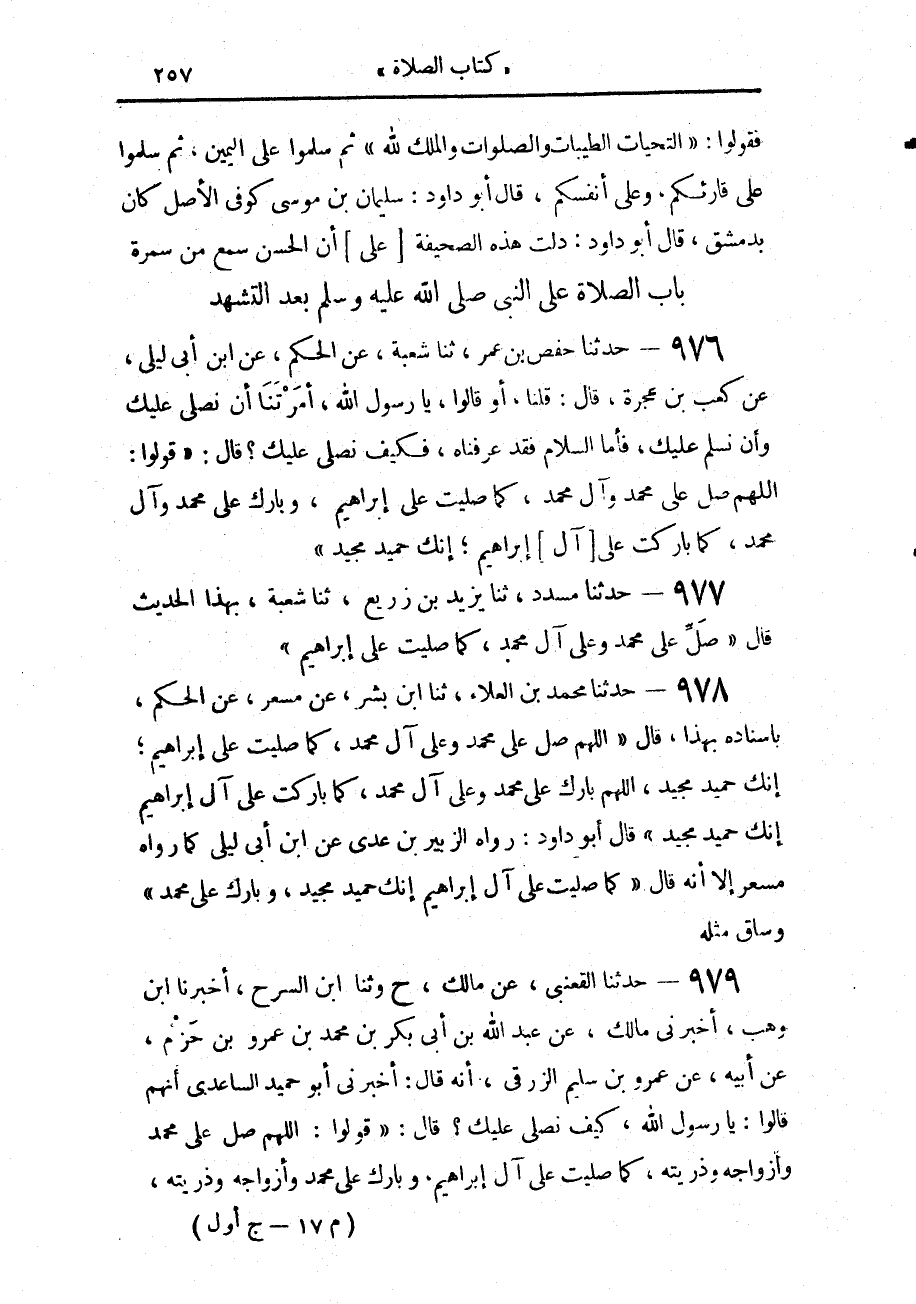 978 - حَدَّثَنَا مُحَمَّدُ بْنُ الْعَلَاءِ، حَدَّثَنَا ابْنُ بِشْرٍ، عَنْ مِسْعَرٍ، عَنِ الْحَكَمِ، بِإِسْنَادِهِ بِهَذَا، قَالَ: " اللَّهُمَّ صَلِّ عَلَى مُحَمَّدٍ، وَعَلَى آلِ مُحَمَّدٍ، كَمَا صَلَّيْتَ عَلَى إِبْرَاهِيمَ، إِنَّكَ حَمِيدٌ مَجِيدٌ، اللَّهُمَّ بَارِكْ عَلَى مُحَمَّدٍ، وَعَلَى آلِ مُحَمَّدٍ، كَمَا بَارَكْتَ عَلَى آلِ إِبْرَاهِيمَ إِنَّكَ حَمِيدٌ مَجِيدٌ، قَالَ أَبُو دَاوُدَ: رَوَاهُ الزُّبَيْرُ بْنُ عَدِيٍّ، عَنِ ابْنِ أَبِي لَيْلَى، كَمَا رَوَاهُ مِسْعَرٌ إِلَّا أَنَّهُ قَالَ: «كَمَا صَلَّيْتَ عَلَى آلِ إِبْرَاهِيمَ إِنَّكَ حَمِيدٌ مَجِيدٌ، وَبَارِكْ عَلَى مُحَمَّدٍ» وَسَاقَ مِثْلَهُ