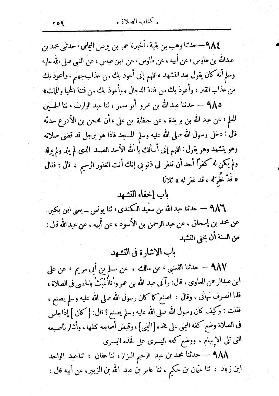 988 - حَدَّثَنَا مُحَمَّدُ بْنُ عَبْدِ الرَّحِيمِ الْبَزَّازُ، حَدَّثَنَا عَفَّانُ، حَدَّثَنَا عَبْدُ الْوَاحِدِ بْنُ زِيَادٍ، حَدَّثَنَا عُثْمَانُ بْنُ حَكِيمٍ، حَدَّثَنَا عَامِرُ بْنُ عَبْدِ اللَّهِ بْنِ الزُّبَيْرِ، عَنْ أَبِيهِ، قَالَ -[260]-: «كَانَ رَسُولُ اللَّهِ صَلَّى اللهُ عَلَيْهِ وَسَلَّمَ §إِذَا قَعَدَ فِي الصَّلَاةِ، جَعَلَ قَدَمَهُ الْيُسْرَى تَحْتَ فَخْذِهِ الْيُمْنَى وَسَاقِهِ، وَفَرَشَ قَدَمَهُ الْيُمْنَى، وَوَضَعَ يَدَهُ الْيُسْرَى عَلَى رُكْبَتِهِ الْيُسْرَى، وَوَضَعَ يَدَهُ الْيُمْنَى عَلَى فَخْذِهِ الْيُمْنَى، وَأَشَارَ بِأُصْبُعِهِ» وَأَرَانَا عَبْدُ الْوَاحِدِ وَأَشَارَ بِالسَّبَّابَةِ