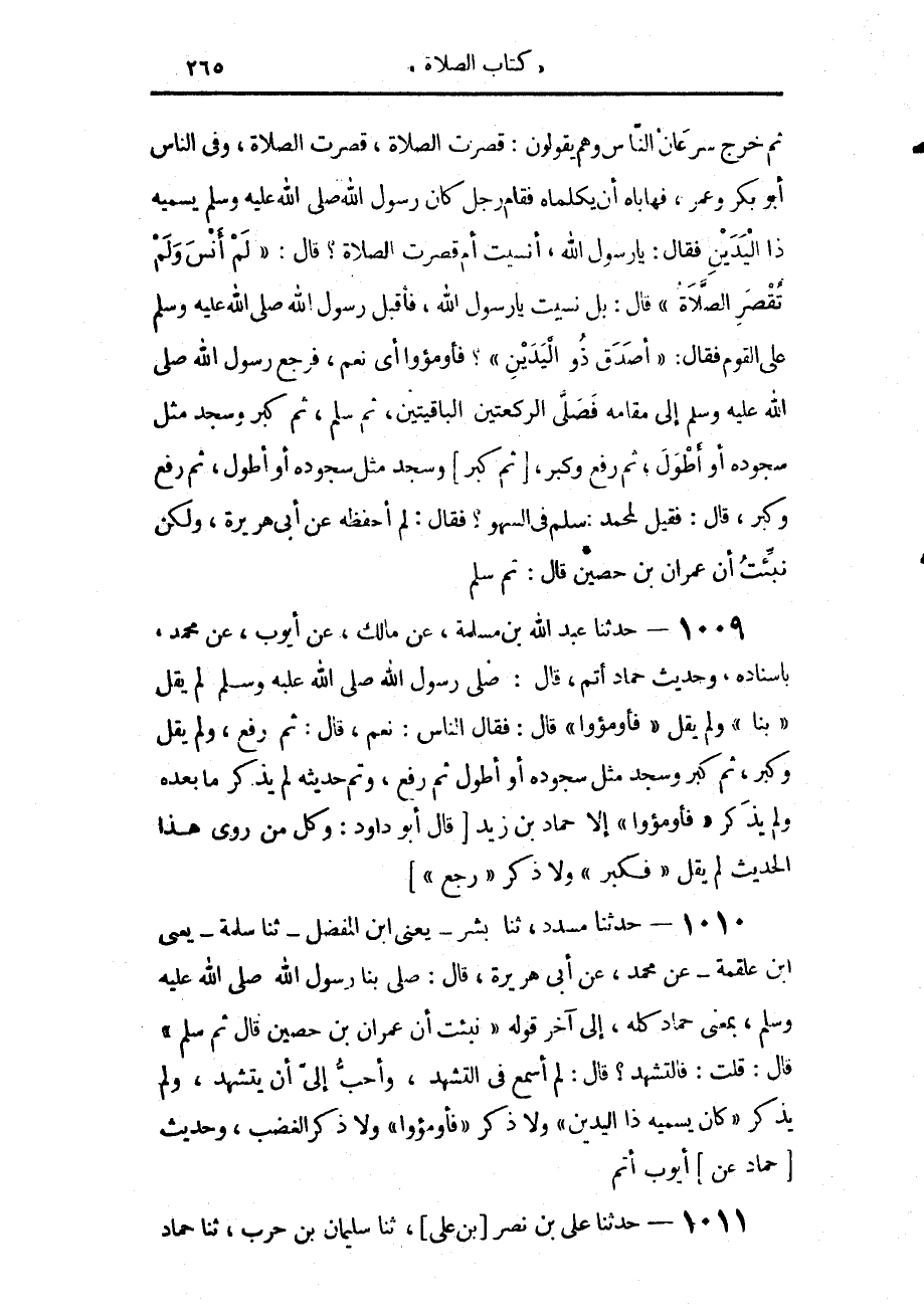 1010 - حَدَّثَنَا مُسَدَّدٌ، حَدَّثَنَا بِشْرٌ يَعْنِي ابْنَ الْمُفَضَّلِ، حَدَّثَنَا سَلَمَةُ يَعْنِي ابْنَ عَلْقَمَةَ، عَنْ مُحَمَّدٍ، عَنْ أَبِي هُرَيْرَةَ، قَالَ: صَلَّى بِنَا رَسُولُ اللَّهِ صَلَّى اللهُ عَلَيْهِ وَسَلَّمَ بِمَعْنَى حَمَّادٍ كُلِّهِ إِلَى آخِرِ قَوْلِهِ: نُبِّئْتُ أَنَّ عِمْرَانَ بْنَ حُصَيْنٍ، قَالَ: ثُمَّ سَلَّمَ، قَالَ: قُلْتُ: فَالتَّشَهُّدُ، قَالَ: لَمْ أَسْمَعْ فِي التَّشَهُّدِ وَأَحَبُّ إِلَيَّ أَنْ يَتَشَهَّدَ، وَلَمْ يَذْكُرْ كَانَ يُسَمِّيهِ ذَا الْيَدَيْنِ، وَلَا ذَكَرَ: فَأَوْمَئُوا، وَلَا ذَكَرَ الْغَضَبَ. وَحَدِيثُ حَمَّادٍ، عَنْ أَيُّوبَ أَتَمُّ،