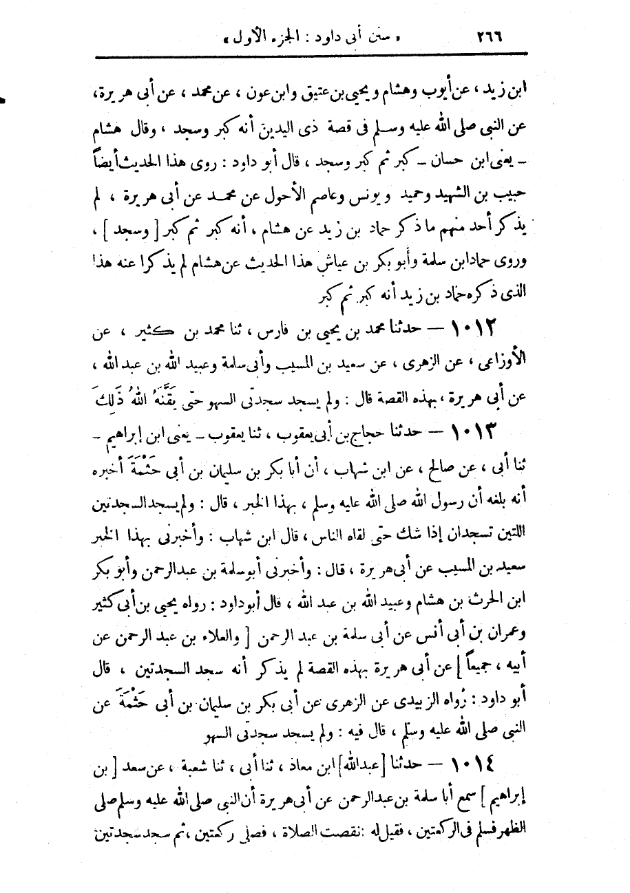 1013 - حَدَّثَنَا حَجَّاجُ بْنُ أَبِي يَعْقُوبَ، حَدَّثَنَا يَعْقُوبُ يَعْنِي ابْنَ إِبْرَاهِيمَ، حَدَّثَنَا أَبِي، عَنْ صَالِحٍ، عَنِ ابْنِ شِهَابٍ، أَنَّ أَبَا بَكْرِ بْنَ سُلَيْمَانَ بْنِ أَبِي حَثْمَةَ، أَخْبَرَهُ أَنَّهُ بَلَغَهُ أَنَّ رَسُولَ اللَّهِ صَلَّى اللهُ عَلَيْهِ وَسَلَّمَ بِهَذَا الْخَبَرِ، قَالَ: وَلَمْ يَسْجُدِ السَّجْدَتَيْنِ اللَّتَيْنِ تُسْجَدَانِ إِذَا شَكَّ حَتَّى لَقَاهُ النَّاسُ، قَالَ ابْنُ شِهَابٍ: وَأَخْبَرَنِي بِهَذَا الْخَبَرِ سَعِيدُ بْنُ الْمُسَيَّبِ، عَنْ أَبِي هُرَيْرَةَ، قَالَ: وَأَخْبَرَنِي أَبُو سَلَمَةَ بْنُ عَبْدِ الرَّحْمَنِ، وَأَبُو بَكْرِ بْنُ الْحَارِثِ بْنِ هِشَامٍ، وَعُبَيْدُ اللَّهِ بْنُ عَبْدِ اللَّهِ، قَالَ أَبُو دَاوُدَ: رَوَاهُ يَحْيَى بْنُ أَبِي كَثِيرٍ، وَعِمْرَانُ بْنُ أَبِي أَنَسٍ، عَنْ أَبِي سَلَمَةَ بْنِ عَبْدِ الرَّحْمَنِ، وَالْعَلَاءِ بْنِ عَبْدِ الرَّحْمَنِ، عَنْ أَبِيهِ، جَمِيعًا، عَنْ أَبِي هُرَيْرَةَ، بِهَذِهِ الْقِصَّةِ وَلَمْ يَذْكُرْ أَنَّهُ سَجَدَ السَّجْدَتَيْنِ، قَالَ أَبُو دَاوُدَ: وَرَوَاهُ الزُّبَيْدِيُّ، عَنِ الزُّهْرِيِّ، عَنْ أَبِي بَكْرِ بْنِ سُلَيْمَانَ بْنِ أَبِي حَثْمَةَ، عَنِ النَّبِيِّ صَلَّى اللهُ عَلَيْهِ وَسَلَّمَ، قَالَ فِيهِ: وَلَمْ يَسْجُدْ سَجْدَتَيِ السَّهْوِ