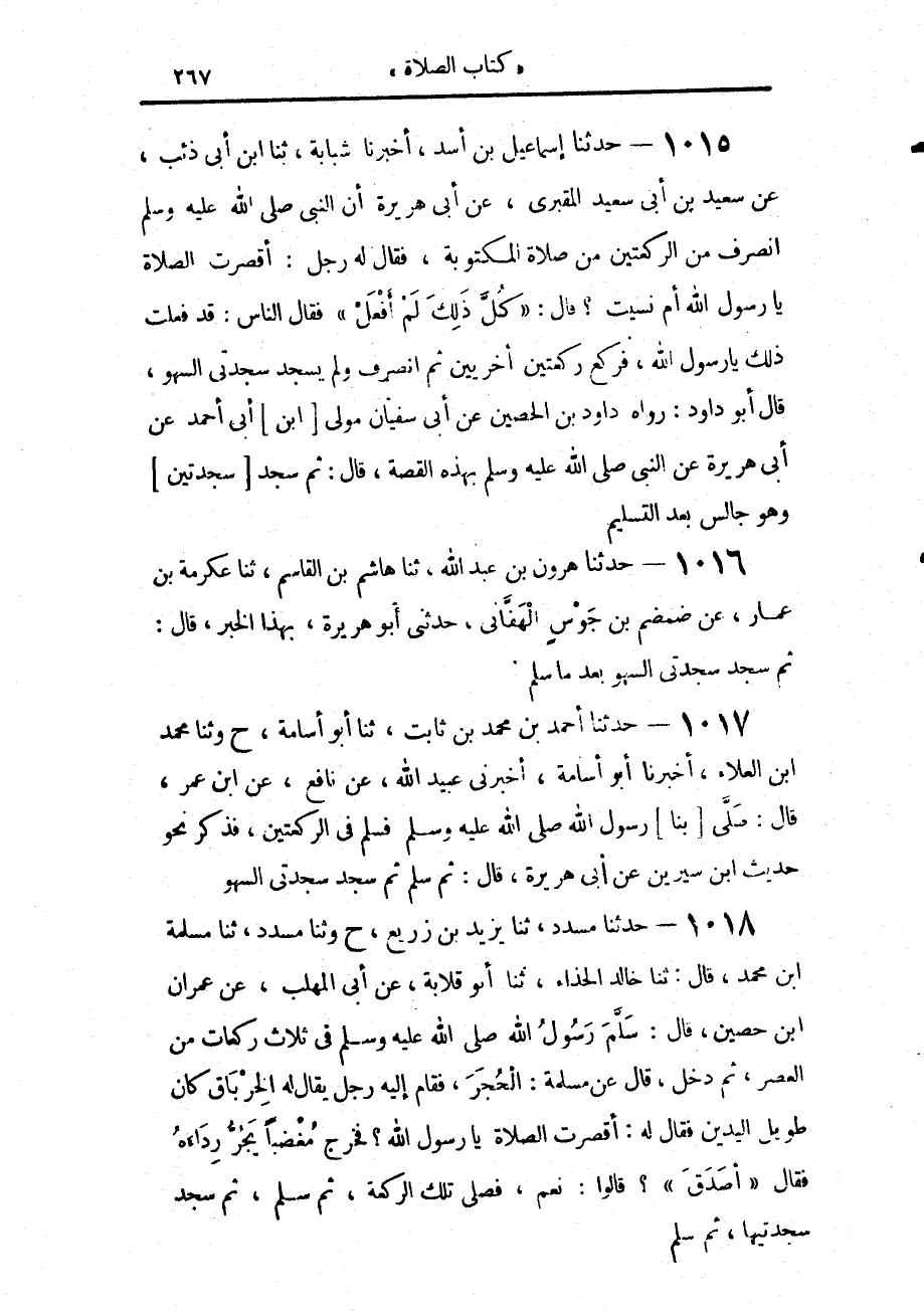 1015 - حَدَّثَنَا إِسْمَاعِيلُ بْنُ أَسَدٍ، أَخْبَرَنَا شَبَابَةُ، حَدَّثَنَا ابْنُ أَبِي ذِئْبٍ، عَنْ سَعِيدِ بْنِ أَبِي سَعِيدٍ الْمَقْبُرِيِّ، عَنْ أَبِي هُرَيْرَةَ، أَنَّ النَّبِيَّ صَلَّى اللهُ عَلَيْهِ وَسَلَّمَ انْصَرَفَ مِنَ الرَّكْعَتَيْنِ مِنْ صَلَاةِ الْمَكْتُوبَةِ، فَقَالَ لَه رَجُلٌ: §أَقُصِرَتِ الصَّلَاةُ يَا رَسُولَ اللَّهِ أَمْ نَسِيتَ؟ قَالَ: «كُلَّ ذَلِكَ لَمْ أَفْعَلْ»، فَقَالَ النَّاسُ: قَدْ فَعَلْتَ ذَلِكَ يَا رَسُولَ اللَّهِ، فَرَكَعَ رَكْعَتَيْنِ أُخْرَيَيْنِ، ثُمَّ انْصَرَفَ وَلَمْ يَسْجُدْ سَجْدَتَيِ السَّهْوِ، قَالَ أَبُو دَاوُدَ: رَوَاهُ دَاوُدُ بْنُ الْحُصَيْنِ، عَنْ أَبِي سُفْيَانَ مَوْلَى ابْنِ أَبِي أَحْمَدَ، عَنْ أَبِي هُرَيْرَةَ، عَنِ النَّبِيِّ صَلَّى اللهُ عَلَيْهِ وَسَلَّمَ بِهَذِهِ الْقِصَّةِ، قَالَ: ثُمَّ سَجَدَ سَجْدَتَيْنِ وَهُوَ جَالِسٌ بَعْدَ التَّسْلِيمِ،