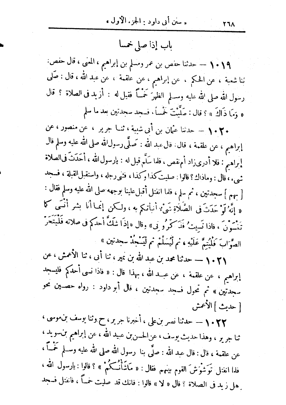 1019 - حَدَّثَنَا حَفْصُ بْنُ عُمَرَ، وَمُسْلِمُ بْنُ إِبْرَاهِيمَ الْمَعْنَى، قَالَ حَفْصٌ: حَدَّثَنَا شُعْبَةُ، عَنِ الْحَكَمِ، عَنْ إِبْرَاهِيمَ، عَنْ عَلْقَمَةَ، عَنْ عَبْدِ اللَّهِ، قَالَ: صَلَّى رَسُولُ اللَّهِ صَلَّى اللهُ عَلَيْهِ وَسَلَّمَ الظُّهْرَ خَمْسًا، فَقِيلَ لَهُ: §أَزِيدَ فِي الصَّلَاةِ؟ قَالَ: «وَمَا ذَاكَ؟» قَالَ: صَلَّيْتَ خَمْسًا، فَسَجَدَ سَجْدَتَيْنِ بَعْدَ مَا سَلَّمَ