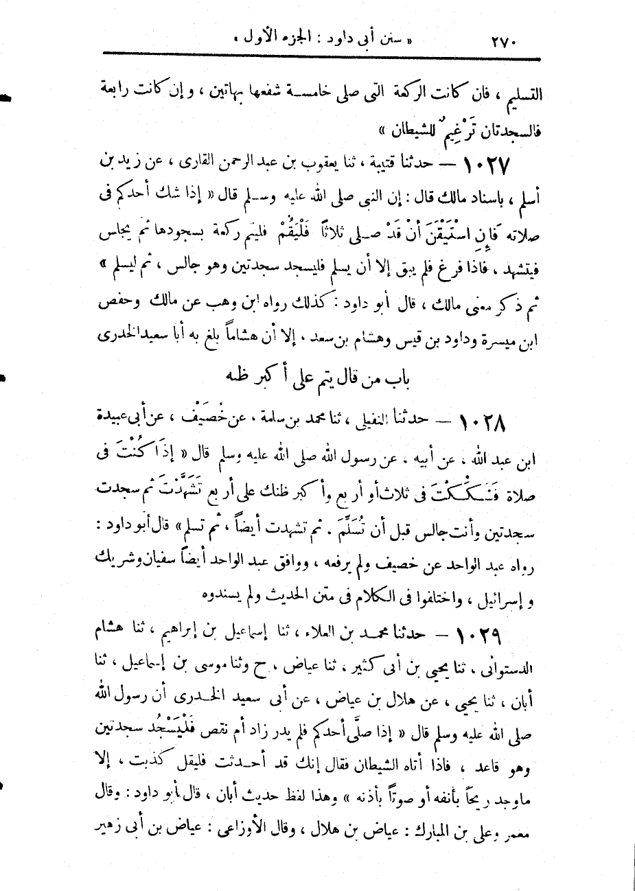 1027 - حَدَّثَنَا قُتَيْبَةُ، حَدَّثَنَا يَعْقُوبُ بْنُ عَبْدِ الرَّحْمَنِ الْقَارِيُّ، عَنْ زَيْدِ بْنِ أَسْلَمَ بِإِسْنَادِ مَالِكٍ قَالَ: إِنَّ النَّبِيَّ صَلَّى اللهُ عَلَيْهِ وَسَلَّمَ قَالَ: «إِذَا شَكَّ أَحَدُكُمْ فِي صَلَاتِهِ فَإِنِ اسْتَيْقَنَ أَنْ قَدْ صَلَّى ثَلَاثًا فَلْيَقُمْ فَلْيُتِمَّ رَكْعَةً بِسُجُودِهَا، ثُمَّ يَجْلِسْ فَيَتَشَهَّدْ، فَإِذَا فَرَغَ فَلَمْ يَبْقَ إِلَّا أَنْ يُسَلِّمَ فَلْيَسْجُدْ سَجْدَتَيْنِ وَهُوَ جَالِسٌ، ثُمَّ لِيُسَلِّمْ»، ثُمَّ ذَكَرَ مَعْنَى مَالِكٍ، قَالَ أَبُو دَاوُدَ: وَكَذَلِكَ رَوَاهُ ابْنُ وَهْبٍ، عَنْ مَالِكٍ، وَحَفْصِ بْنِ مَيْسَرَةَ، وَدَاوُدَ بْنِ قَيْسٍ، وَهِشَامِ بْنِ سَعْدٍ، إِلَّا أَنَّ هِشَامًا بَلَغَ بِهِ أَبَا سَعِيدٍ الْخُدْرِيَّ