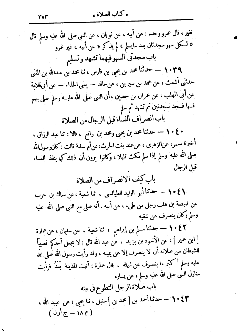 1040 - حَدَّثَنَا مُحَمَّدُ بْنُ يَحْيَى، وَمُحَمَّدُ بْنُ رَافِعٍ، قَالَا: حَدَّثَنَا عَبْدُ الرَّزَّاقِ، أَخْبَرَنَا مَعْمَرٌ، عَنِ الزُّهْرِيِّ، عَنْ هِنْدِ بِنْتِ الْحَارِثِ، عَنْ أُمِّ سَلَمَةَ، قَالَتْ: «كَانَ رَسُولُ اللَّهِ صَلَّى اللهُ عَلَيْهِ وَسَلَّمَ §إِذَا سَلَّمَ مَكَثَ قَلِيلًا، وَكَانُوا يَرَوْنَ أَنَّ ذَلِكَ، كَيْمَا يَنْفُذُ النِّسَاءُ قَبْلَ الرِّجَالِ»