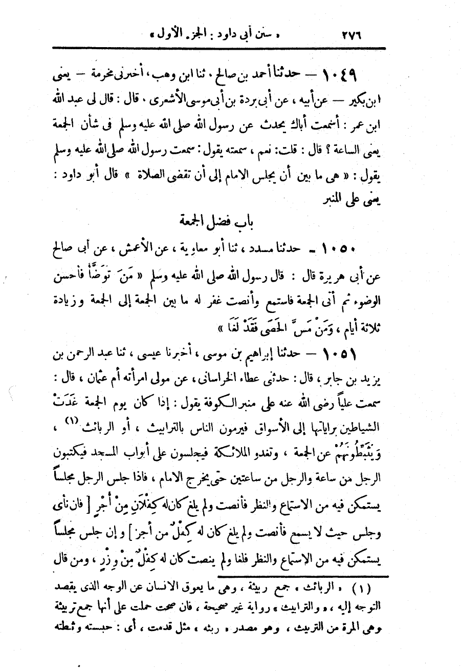 1051 - حَدَّثَنَا إِبْرَاهِيمُ بْنُ مُوسَى، أَخْبَرَنَا عِيسَى، حَدَّثَنَا عَبْدُ الرَّحْمَنِ بْنُ يَزِيدَ بْنِ جَابِرٍ، قَالَ: حَدَّثَنِي عَطَاءٌ الْخُرَاسَانِيُّ، عَنْ مَوْلَى امْرَأَتِهِ أُمِّ عُثْمَانَ، قَالَ: سَمِعْتُ عَلِيًّا، رَضِيَ اللَّهُ عَنْهُ عَلَى مِنْبَرِ الْكُوفَةِ يَقُولُ: " §إِذَا كَانَ يَوْمُ الْجُمُعَةِ، غَدَتِ الشَّيَاطِينُ بِرَايَاتِهَا إِلَى الْأَسْوَاقِ، فَيَرْمُونَ النَّاسَ بِالتَّرَابِيثِ، أَوِ الرَّبَائِثِ، وَيُثَبِّطُونَهُمْ عَنِ الْجُمُعَةِ، وَتَغْدُو الْمَلَائِكَةُ فَيَجْلِسُونَ عَلَى أَبْوَابِ الْمَسْجِدِ، فَيَكْتُبُونَ الرَّجُلَ مِنْ سَاعَةٍ، وَالرَّجُلَ مِنْ سَاعَتَيْنِ، حَتَّى يَخْرُجَ الْإِمَامُ، فَإِذَا جَلَسَ الرَّجُلُ مَجْلِسًا يَسْتَمْكِنُ فِيهِ مِنَ الِاسْتِمَاعِ وَالنَّظَرِ، فَأَنْصَتَ وَلَمْ يَلْغُ كَانَ لَهُ كِفْلَانِ مِنْ أَجْرٍ، فَإِنْ نَأَى وَجَلَسَ حَيْثُ لَا يَسْمَعُ فَأَنْصَتَ وَلَمْ يَلْغُ لَهُ كِفْلٌ مِنْ أَجْرٍ، وَإِنْ جَلَسَ مَجْلِسًا يَسْتَمْكِنُ فِيهِ مِنَ الِاسْتِمَاعِ وَالنَّظَرِ فَلَغَا، وَلَمْ يُنْصِتْ كَانَ لَهُ كِفْلٌ مِنْ وِزْرٍ، وَمَنْ قَالَ -[277]- يَوْمَ الْجُمُعَةِ لِصَاحِبِهِ: صَهٍ، فَقَدْ لَغَا، وَمَنْ لَغَا فَلَيْسَ لَهُ فِي جُمُعَتِهِ تِلْكَ شَيْءٌ "، ثُمَّ يَقُولُ فِي آخِرِ ذَلِكَ: سَمِعْتُ رَسُولَ اللَّهِ صَلَّى اللهُ عَلَيْهِ وَسَلَّمَ يَقُولُ ذَلِكَ، قَالَ أَبُو دَاوُدَ: " رَوَاهُ الْوَلِيدُ بْنُ مُسْلِمٍ، عَنْ ابْنِ جَابِرٍ، قَالَ: بِالرَّبَائِثِ، وَقَالَ: مَوْلَى امْرَأَتِهِ أُمِّ عُثْمَانَ بْنِ عَطَاءٍ