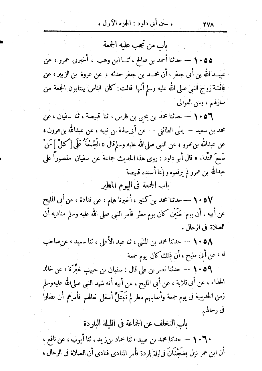 1056 - حَدَّثَنَا مُحَمَّدُ بْنُ يَحْيَى بْنِ فَارِسٍ، حَدَّثَنَا قَبِيصَةُ، حَدَّثَنَا سُفْيَانُ، عَنْ مُحَمَّدِ بْنِ سَعِيدٍ يَعْنِي الطَّائِفِيَّ، عَنْ أَبِي سَلَمَةَ بْنِ نُبَيْهٍ، عَنْ عَبْدِ اللَّهِ بْنِ هَارُونَ، عَنْ عَبْدِ اللَّهِ بْنِ عَمْرٍو، عَنِ النَّبِيِّ صَلَّى اللهُ عَلَيْهِ وَسَلَّمَ قَالَ: «§الْجُمُعَةُ عَلَى كُلِّ مَنْ سَمِعَ النِّدَاءَ»، قَالَ أَبُو دَاوُدَ: «رَوَى هَذَا الْحَدِيثَ جَمَاعَةٌ، عَنْ سُفْيَانَ، مَقْصُورًا عَلَى عَبْدِ اللَّهِ بْنِ عَمْرٍو، وَلَمْ يَرْفَعُوهُ، وَإِنَّمَا أَسْنَدَهُ قَبِيصَةُ»