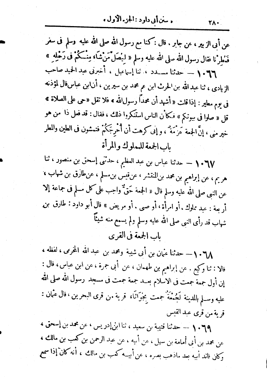 1067 - حَدَّثَنَا عَبَّاسُ بْنُ عَبْدِ الْعَظِيمِ، حَدَّثَنِي إِسْحَاقُ بْنُ مَنْصُورٍ، حَدَّثَنَا هُرَيْمٌ، عَنْ إِبْرَاهِيمَ بْنِ مُحَمَّدِ بْنِ الْمُنْتَشِرِ، عَنْ قَيْسِ بْنِ مُسْلِمٍ، عَنْ طَارِقِ بْنِ شِهَابٍ، عَنِ النَّبِيِّ صَلَّى اللهُ عَلَيْهِ وَسَلَّمَ قَالَ: " §الْجُمُعَةُ حَقٌّ وَاجِبٌ عَلَى كُلِّ مُسْلِمٍ فِي جَمَاعَةٍ إِلَّا أَرْبَعَةً: عَبْدٌ مَمْلُوكٌ، أَوِ امْرَأَةٌ، أَوْ صَبِيٌّ، أَوْ مَرِيضٌ "، قَالَ أَبُو دَاوُدَ: «طَارِقُ بْنُ شِهَابٍ، قَدْ رَأَى النَّبِيَّ صَلَّى اللهُ عَلَيْهِ وَسَلَّمَ وَلَمْ يَسْمَعْ مِنْهُ شَيْئًا»
