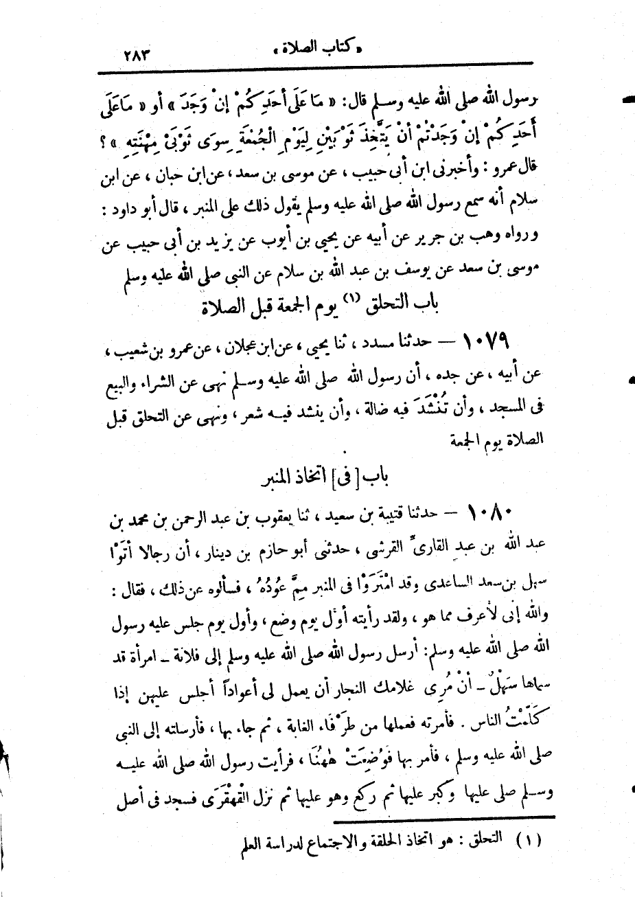 1080 - حَدَّثَنَا قُتَيْبَةُ بْنُ سَعِيدٍ، حَدَّثَنَا يَعْقُوبُ بْنُ عَبْدِ الرَّحْمَنِ بْنِ مُحَمَّدِ بْنِ عَبْدِ اللَّهِ بْنِ عَبْدٍ الْقَارِيُّ الْقُرَشِيُّ، حَدَّثَنِي أَبُو حَازِمِ بْنُ دِينَارٍ، أَنَّ رِجَالًا أَتَوْا سَهْلَ بْنَ سَعْدٍ السَّاعِدِيَّ، وَقَدْ امْتَرَوْا فِي الْمِنْبَرِ مِمَّ عُودُهُ، فَسَأَلُوهُ عَنْ ذَلِكَ، فَقَالَ: وَاللَّهِ إِنِّي لَأَعْرِفُ مِمَّا هُوَ، وَلَقَدْ رَأَيْتُهُ أَوَّلَ يَوْمٍ وُضِعَ، وَأَوَّلَ يَوْمٍ جَلَسَ عَلَيْهِ رَسُولُ اللَّهِ صَلَّى اللهُ عَلَيْهِ وَسَلَّمَ، أَرْسَلَ رَسُولُ اللَّهِ صَلَّى اللهُ عَلَيْهِ وَسَلَّمَ إِلَى فُلَانَةَ - امْرَأَةٌ قَدْ سَمَّاهَا سَهْلٌ -، أَنْ مُرِي غُلَامَكِ النَّجَّارَ أَنْ يَعْمَلَ لِي أَعْوَادًا أَجْلِسُ عَلَيْهِنَّ إِذَا كَلَّمْتُ النَّاسَ، فَأَمَرَتْهُ، فَعَمِلَهَا مِنْ طَرْفَاءِ الْغَابَةِ، ثُمَّ جَاءَ بِهَا فَأَرْسَلَتْهُ إِلَى النَّبِيِّ صَلَّى اللهُ عَلَيْهِ وَسَلَّمَ، فَأَمَرَ بِهَا فَوُضِعَتْ هَاهُنَا، فَرَأَيْتُ رَسُولَ اللَّهِ صَلَّى اللهُ عَلَيْهِ وَسَلَّمَ، صَلَّى عَلَيْهَا وَكَبَّرَ عَلَيْهَا، ثُمَّ رَكَعَ وَهُوَ عَلَيْهَا، ثُمَّ نَزَلَ الْقَهْقَرَى، فَسَجَدَ فِي أَصْلِ -[284]- الْمِنْبَرِ، ثُمَّ عَادَ، فَلَمَّا فَرَغَ أَقْبَلَ عَلَى النَّاسِ، فَقَالَ: «أَيُّهَا النَّاسُ، §إِنَّمَا صَنَعْتُ هَذَا لِتَأْتَمُّوا بِي، وَلِتَعْلَمُوا صَلَاتِي»