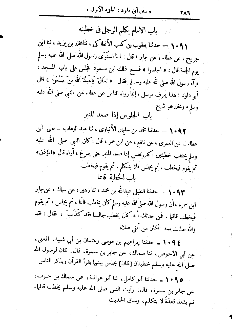 1094 - حَدَّثَنَا إِبْرَاهِيمُ بْنُ مُوسَى، وَعُثْمَانُ بْنُ أَبِي شَيْبَةَ، الْمَعْنَى، عَنْ أَبِي الْأَحْوَصِ، حَدَّثَنَا سِمَاكٌ، عَنْ جَابِرِ بْنِ سَمُرَةَ، قَالَ: «§كَانَ لِرَسُولِ اللَّهِ صَلَّى اللهُ عَلَيْهِ وَسَلَّمَ خُطْبَتَانِ كَانَ يَجْلِسُ بَيْنَهُمَا يَقْرَأُ الْقُرْآنَ، وَيُذَكِّرُ النَّاسَ»،