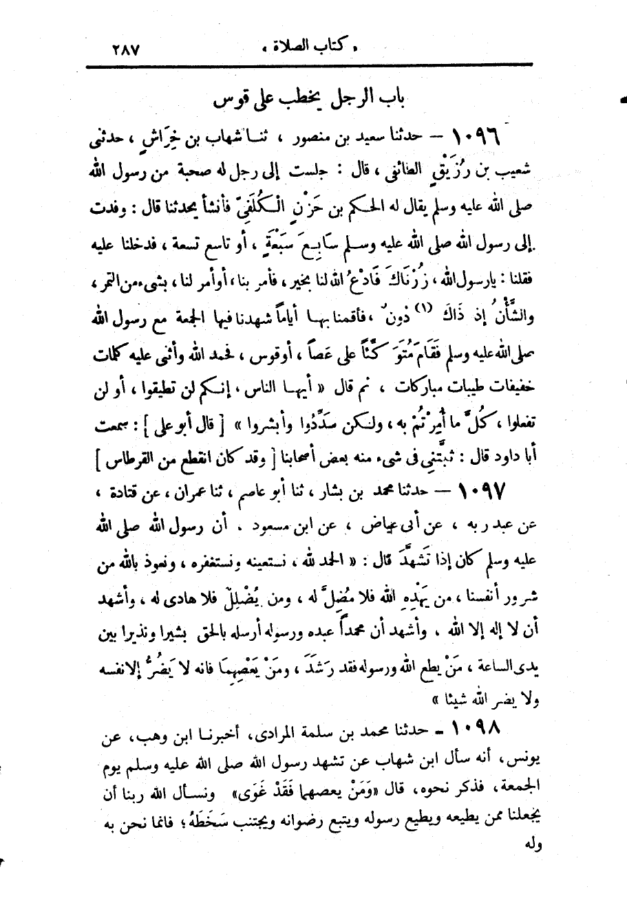 1096 - حَدَّثَنَا سَعِيدُ بْنُ مَنْصُورٍ، حَدَّثَنَا شِهَابُ بْنُ خِرَاشٍ، حَدَّثَنِي شُعَيْبُ بْنُ رُزَيْقٍ الطَّائِفِيُّ، قَالَ: جَلَسْتُ إِلَى رَجُلٍ لَهُ صُحْبَةٌ مِنْ رَسُولِ اللَّهِ صَلَّى اللهُ عَلَيْهِ وَسَلَّمَ، يُقَالُ لَهُ: الْحَكَمُ بْنُ حَزْنٍ الْكُلَفِيُّ، فَأَنْشَأَ يُحَدِّثُنَا، قَالَ: وَفَدْتُ إِلَى رَسُولِ اللَّهِ صَلَّى اللهُ عَلَيْهِ وَسَلَّمَ سَابِعَ سَبْعَةٍ - أَوْ تَاسِعَ تِسْعَةٍ - فَدَخَلْنَا عَلَيْهِ، فَقُلْنَا: يَا رَسُولَ اللَّهِ، زُرْنَاكَ فَادْعُ اللَّهَ لَنَا بِخَيْرٍ، فَأَمَرَ بِنَا، أَوْ أَمَرَ لَنَا بِشَيْءٍ مِنَ التَّمْرِ، وَالشَّأْنُ إِذْ ذَاكَ دُونٌ، فَأَقَمْنَا بِهَا أَيَّامًا شَهِدْنَا فِيهَا الْجُمُعَةَ مَعَ رَسُولِ اللَّهِ صَلَّى اللهُ عَلَيْهِ وَسَلَّمَ، فَقَامَ مُتَوَكِّئًا عَلَى عَصًا، أَوْ قَوْسٍ، فَحَمِدَ اللَّهَ وَأَثْنَى عَلَيْهِ، كَلِمَاتٍ خَفِيفَاتٍ طَيِّبَاتٍ مُبَارَكَاتٍ، ثُمَّ قَالَ: «أَيُّهَا النَّاسُ، §إِنَّكُمْ لَنْ تُطِيقُوا - أَوْ لَنْ تَفْعَلُوا - كُلَّ مَا أُمِرْتُمْ بِهِ، وَلَكِنْ سَدِّدُوا، وَأَبْشِرُوا»، قَالَ أَبُو عَلِيٍّ: سَمِعْتُ أَبَا دَاوُدَ قَالَ: «ثَبَّتَنِي فِي شَيْءٍ مِنْهُ بَعْضُ أَصْحَابِنَا، وَقَدْ كَانَ انْقَطَعَ مِنَ القِرْطَاسِ»