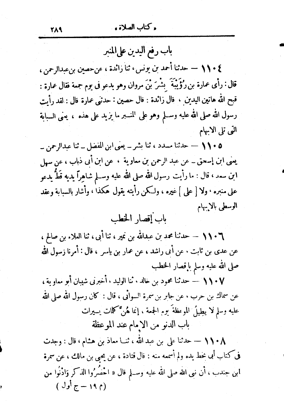 1104 - حَدَّثَنَا أَحْمَدُ بْنُ يُونُسَ، حَدَّثَنَا زَائِدَةُ، عَنْ حُصَيْنِ بْنِ عَبْدِ الرَّحْمَنِ، قَالَ: رَأَى عُمَارَةُ بْنُ رُوَيْبَةَ بِشْرَ بْنَ مَرْوَانَ، وَهُوَ يَدْعُو فِي يَوْمِ جُمُعَةٍ، فَقَالَ عُمَارَةُ: قَبَّحَ اللَّهُ هَاتَيْنِ الْيَدَيْنِ، قَالَ زَائِدَةُ: قَالَ حُصَيْنٌ: حَدَّثَنِي عُمَارَةُ، قَالَ: «لَقَدْ §رَأَيْتُ رَسُولَ اللَّهِ صَلَّى اللهُ عَلَيْهِ وَسَلَّمَ، وَهُوَ عَلَى الْمِنْبَرِ مَا يَزِيدُ عَلَى هَذِهِ» يَعْنِي السَّبَّابَةَ الَّتِي تَلِي الْإِبْهَامَ