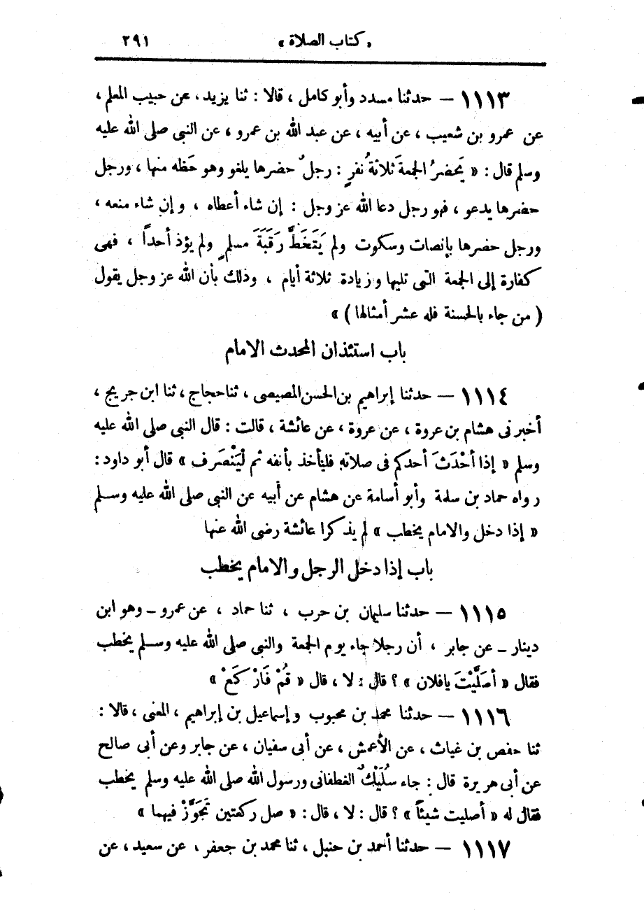 1117 - حَدَّثَنَا أَحْمَدُ بْنُ حَنْبَلٍ، حَدَّثَنَا مُحَمَّدُ بْنُ جَعْفَرٍ، عَنْ سَعِيدٍ، عَنِ -[292]- الْوَلِيدِ أَبِي بِشْرٍ، عَنْ طَلْحَةَ، أَنَّهُ سَمِعَ جَابِرَ بْنَ عَبْدِ اللَّهِ، يُحَدِّثُ، أَنَّ سُلَيْكًا جَاءَ فَذَكَرَ نَحْوَهُ زَادَ، ثُمَّ أَقْبَلَ عَلَى النَّاسِ قَالَ: «إِذَا جَاءَ أَحَدُكُمْ وَالْإِمَامُ يَخْطُبُ فَلْيُصَلِّ رَكْعَتَيْنِ يَتَجَوَّزْ فِيهِمَا»