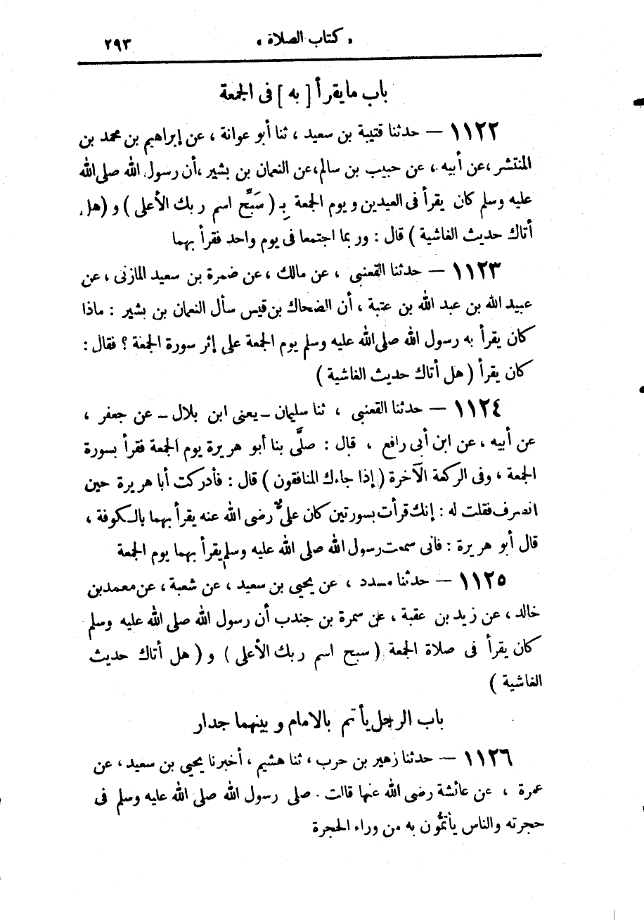 1122 - حَدَّثَنَا قُتَيْبَةُ بْنُ سَعِيدٍ، حَدَّثَنَا أَبُو عَوَانَةَ، عَنْ إِبْرَاهِيمَ بْنِ مُحَمَّدِ بْنِ الْمُنْتَشِرِ، عَنْ أَبِيهِ، عَنْ حَبِيبِ بْنِ سَالِمٍ، عَنِ النُّعْمَانِ بْنِ بَشِيرٍ، " أَنَّ رَسُولَ اللَّهِ صَلَّى اللهُ عَلَيْهِ وَسَلَّمَ كَانَ §يَقْرَأُ فِي الْعِيدَيْنِ وَيَوْمِ الْجُمُعَةِ: بِسَبِّحِ اسْمَ رَبِّكَ الْأَعْلَى، وَهَلْ أَتَاكَ حَدِيثُ الْغَاشِيَةِ "، قَالَ: «وَرُبَّمَا اجْتَمَعَا فِي يَوْمٍ وَاحِدٍ، فَقَرَأَ بِهِمَا»