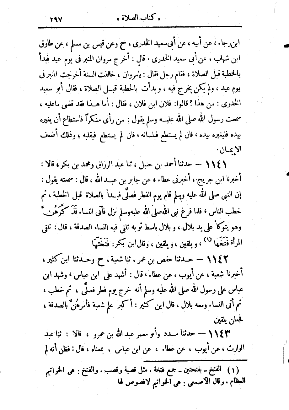 1141 - حَدَّثَنَا أَحْمَدُ بْنُ حَنْبَلٍ، حَدَّثَنَا عَبْدُ الرَّزَّاقِ، وَمُحَمَّدُ بْنُ بَكْرٍ، قَالَا: أَخْبَرَنَا ابْنُ جُرَيْجٍ، أَخْبَرَنِي عَطَاءٌ، عَنْ جَابِرِ بْنِ عَبْدِ اللَّهِ، قَالَ: سَمِعْتُهُ يَقُولُ: إِنَّ النَّبِيَّ صَلَّى اللهُ عَلَيْهِ وَسَلَّمَ «§قَامَ يَوْمَ الْفِطْرِ فَصَلَّى، فَبَدَأَ بِالصَّلَاةِ قَبْلَ الْخُطْبَةِ، ثُمَّ خَطَبَ النَّاسَ، فَلَمَّا فَرَغَ نَبِيُّ اللَّهِ صَلَّى اللهُ عَلَيْهِ وَسَلَّمَ، نَزَلَ فَأَتَى النِّسَاءَ، فَذَكَّرَهُنَّ وَهُوَ يَتَوَكَّأُ عَلَى يَدِ بِلَالٍ، وَبِلَالٌ بَاسِطٌ ثَوْبَهُ تُلْقِي فِيهِ النِّسَاءُ الصَّدَقَةَ»، قَالَ: تُلْقِي الْمَرْأَةُ فَتَخَهَا وَيُلْقِينَ وَيُلْقِينَ، وَقَالَ ابْنُ بَكْرٍ: فَتَخَتَهَا