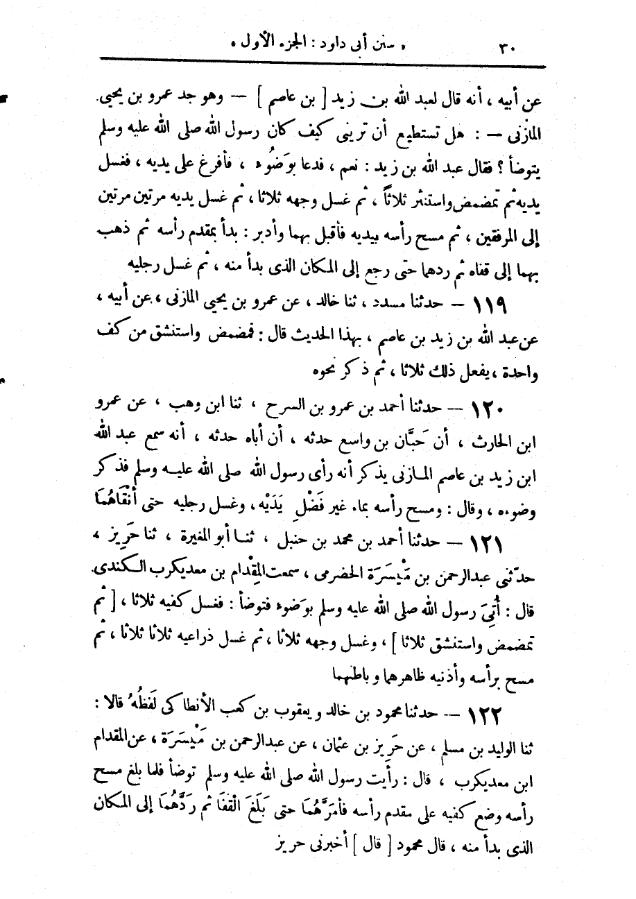 120 - حَدَّثَنَا أَحْمَدُ بْنُ عَمْرِو بْنِ السَّرْحِ، حَدَّثَنَا ابْنُ وَهْبٍ، عَنْ عَمْرِو بْنِ الْحَارِثِ، أَنَّ حَبَّانَ بْنَ وَاسِعٍ، حَدَّثَهُ أَنَّ أَبَاهُ حَدَّثَهُ، أَنَّهُ سَمِعَ عَبْدَ اللَّهِ بْنَ زَيْدِ بْنِ عَاصِمٍ الْمَازِنِيَّ، يَذْكُرُ أَنَّهُ رَأَى رَسُولَ اللَّهِ صَلَّى اللهُ عَلَيْهِ وَسَلَّمَ فَذَكَرَ وُضُوءَهُ، وَقَالَ: «§وَمَسَحَ رَأْسَهُ بِمَاءٍ غَيْرِ فَضْلِ يَدَيْهِ، وَغَسَلَ رِجْلَيْهِ حَتَّى أَنْقَاهُمَا»