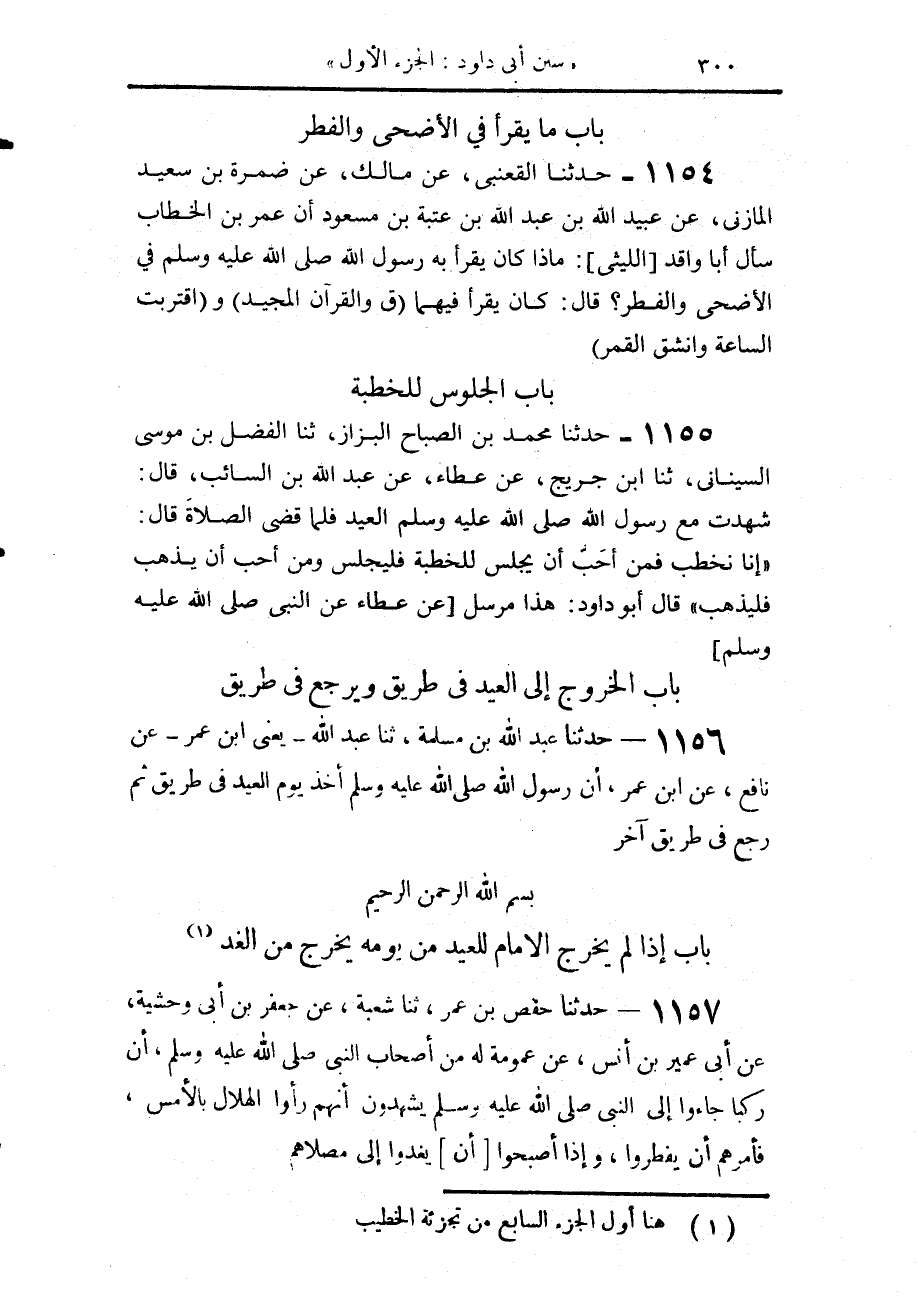 1155 - حَدَّثَنَا مُحَمَّدُ بْنُ الصَّبَّاحِ الْبَزَّازُ، حَدَّثَنَا الْفَضْلُ بْنُ مُوسَى السِّينَانِيُّ، حَدَّثَنَا ابْنُ جُرَيْجٍ، عَنْ عَطَاءٍ، عَنْ عَبْدِ اللَّهِ بْنِ السَّائِبِ، قَالَ: شَهِدْتُ مَعَ رَسُولِ اللَّهِ صَلَّى اللهُ عَلَيْهِ وَسَلَّمَ الْعِيدَ، فَلَمَّا قَضَى الصَّلَاةَ، قَالَ: «§إِنَّا نَخْطُبُ، فَمَنْ أَحَبَّ أَنْ يَجْلِسَ لِلْخُطْبَةِ فَلْيَجْلِسْ، وَمَنْ أَحَبَّ أَنْ يَذْهَبَ فَلْيَذْهَبْ»، قَالَ أَبُو دَاوُدَ: «هَذَا مُرْسَلٌ عَنْ عَطَاءٍ، عَنِ النَّبِيِّ صَلَّى اللهُ عَلَيْهِ وَسَلَّمَ»