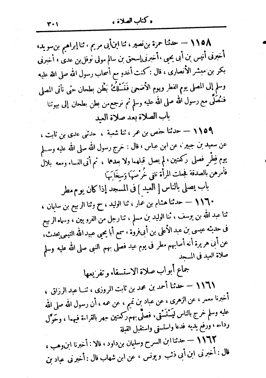 1160 - حَدَّثَنَا هِشَامُ بْنُ عَمَّارٍ، حَدَّثَنَا الْوَلِيدُ، ح وحَدَّثَنَا الرَّبِيعُ بْنُ سُلَيْمَانَ، حَدَّثَنَا عَبْدُ اللَّهِ بْنُ يُوسُفَ، حَدَّثَنَا الْوَلِيدُ بْنُ مُسْلِمٍ، حَدَّثَنَا رَجُلٌ مِنَ الْقَرَوِيِّينَ، وَسَمَّاهُ الرَّبِيعُ فِي حَدِيثِهِ عِيسَى بْنَ عَبْدِ الْأَعْلَى بْنِ أَبِي فَرْوَةَ، سَمِعَ أَبَا يَحْيَى عُبَيْدَ اللَّهِ التَّيْمِيَّ، يُحَدِّثُ عَنْ أَبِي هُرَيْرَةَ، «أَنَّهُ §أَصَابَهُمْ مَطَرٌ فِي يَوْمِ عِيدٍ، فَصَلَّى بِهِمُ النَّبِيُّ صَلَّى اللهُ عَلَيْهِ وَسَلَّمَ صَلَاةَ الْعِيدِ فِي الْمَسْجِدِ»