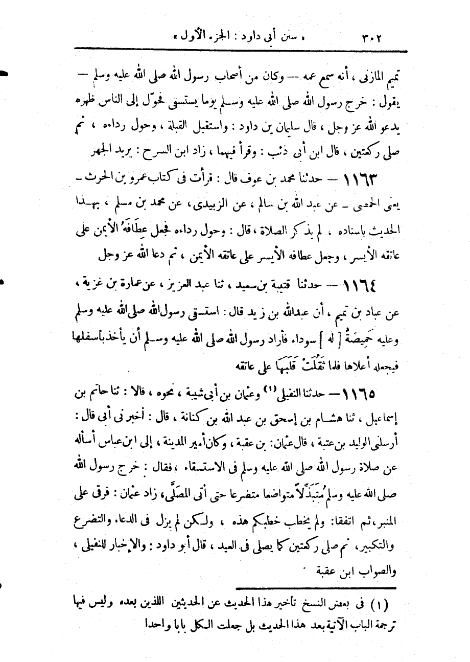 1165 - حَدَّثَنَا النُّفَيْلِيُّ، وَعُثْمَانُ بْنُ أَبِي شَيْبَةَ، نَحْوَهُ قَالَا: حَدَّثَنَا حَاتِمُ بْنُ إِسْمَاعِيلَ، حَدَّثَنَا هِشَامُ بْنُ إِسْحَاقَ بْنِ عَبْدِ اللَّهِ بْنِ كِنَانَةَ، قَالَ: أَخْبَرَنِي أَبِي، قَالَ: أَرْسَلَنِي الْوَلِيدُ بْنُ عُتْبَةَ - قَالَ عُثْمَانُ ابْنُ عُقْبَةَ: وَكَانَ أَمِيرَ الْمَدِينَةِ - إِلَى ابْنِ عَبَّاسٍ، أَسْأَلُهُ عَنْ صَلَاةِ رَسُولِ اللَّهِ صَلَّى اللهُ عَلَيْهِ وَسَلَّمَ فِي الِاسْتِسْقَاءِ، فَقَالَ: «§خَرَجَ رَسُولُ اللَّهِ صَلَّى اللهُ عَلَيْهِ وَسَلَّمَ مُتَبَذِّلًا مُتَوَاضِعًا، مُتَضَرِّعًا، حَتَّى أَتَى الْمُصَلَّى - زَادَ عُثْمَانُ، فَرَقَى عَلَى الْمِنْبَرِ، ثُمَّ اتَّفَقَا، - وَلَمْ يَخْطُبْ خُطَبَكُمْ هَذِهِ، وَلَكِنْ لَمْ يَزَلْ فِي الدُّعَاءِ، وَالتَّضَرُّعِ، وَالتَّكْبِيرِ، ثُمَّ صَلَّى رَكْعَتَيْنِ، كَمَا يُصَلِّي فِي الْعِيدِ»، قَالَ أَبُو دَاوُدَ: «وَالْإِخْبَارُ لِلنُّفَيْلِيِّ، وَالصَّوَابُ ابْنُ عُقْبَةَ»